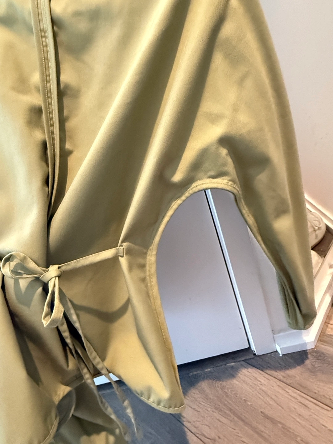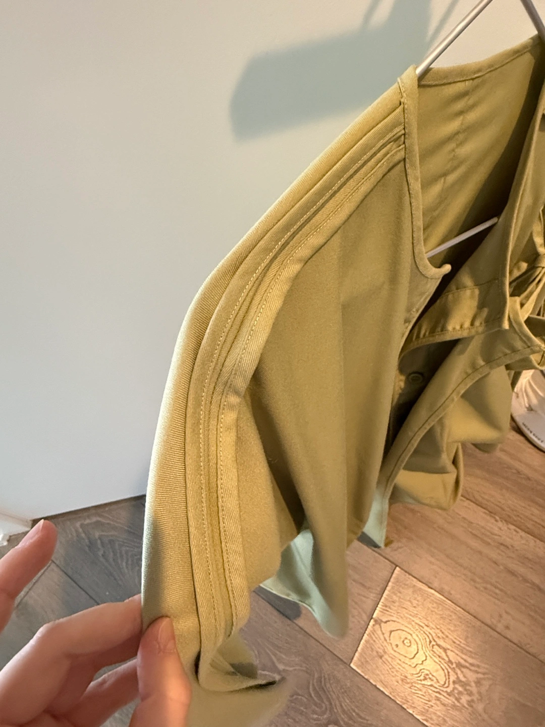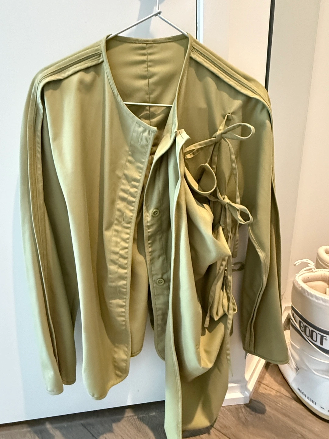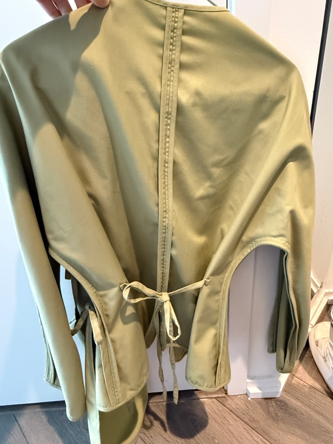 Unique sage green shirt featuring a button-up front and detachable overlay. Long sleeves with interesting seam detailing. Relaxed fit. Can be easily adjusted by the string on the back.