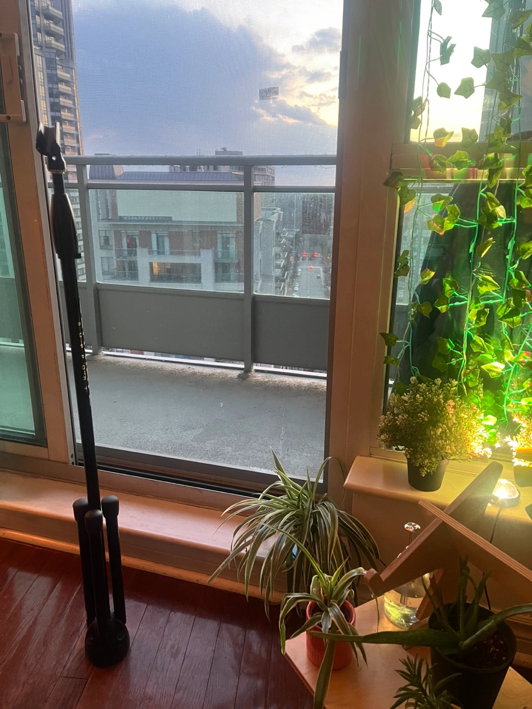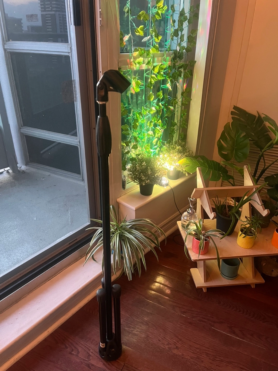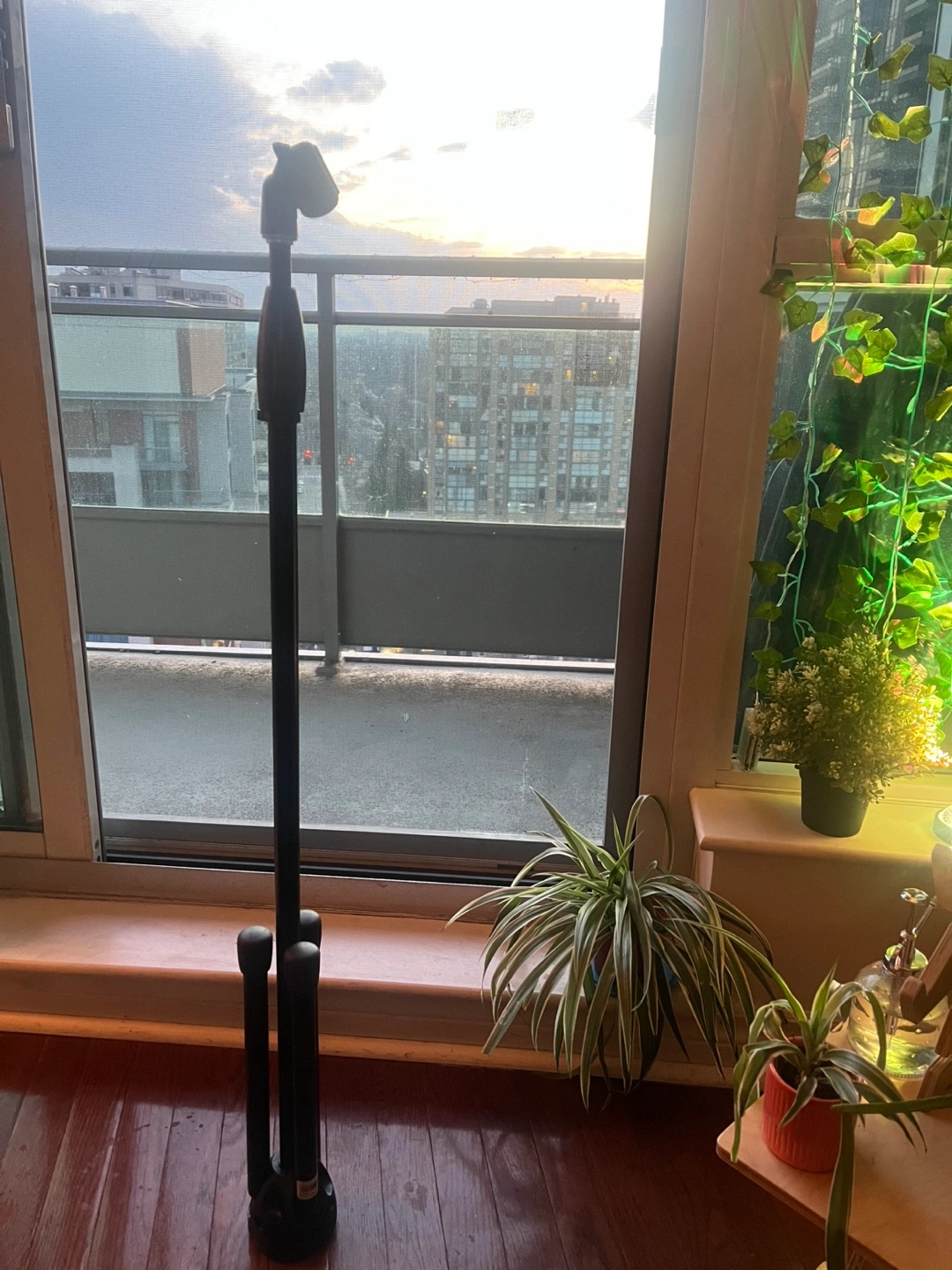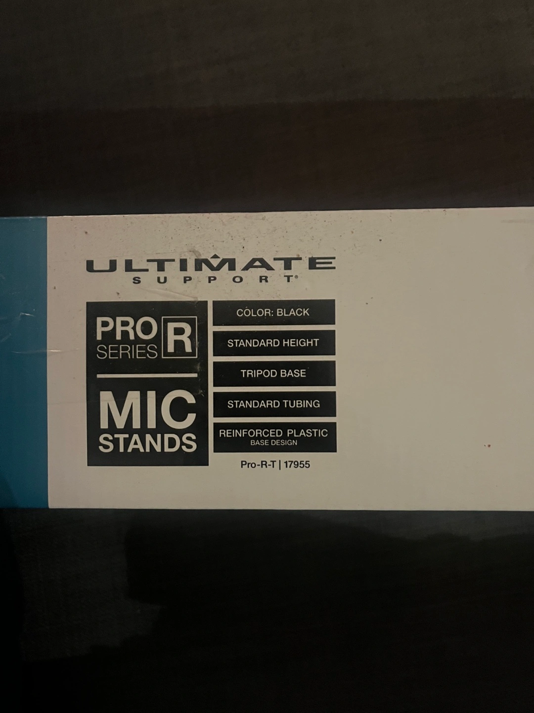 Black microphone stand. Tripod base. Standard height. Reinforced plastic. Good condition.