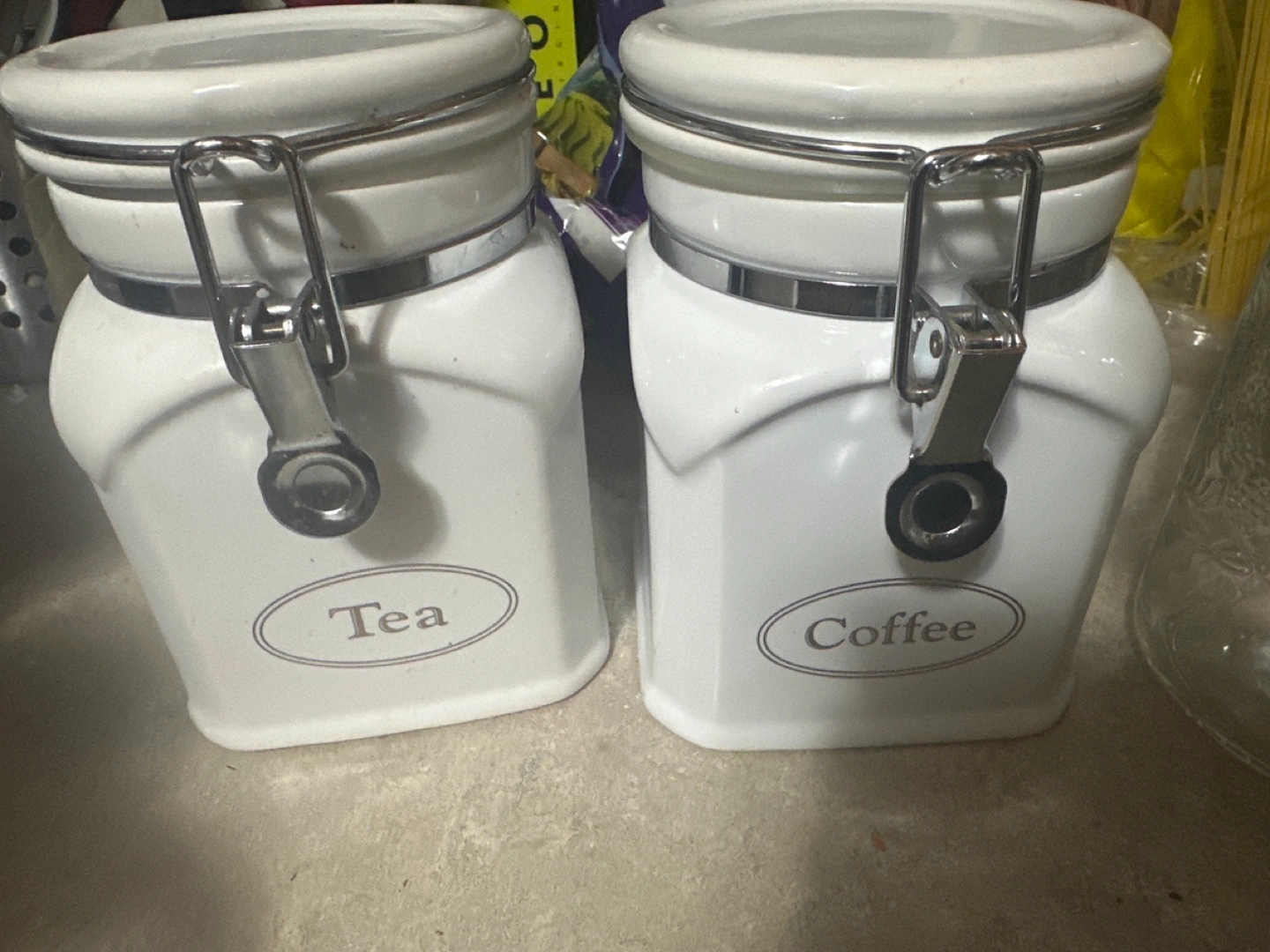 Pair of white ceramic canisters. Each features a metal clasp closure and an etched label. One labelled 'Tea', the other 'Coffee'. Perfect for storing your favourite pantry staples.