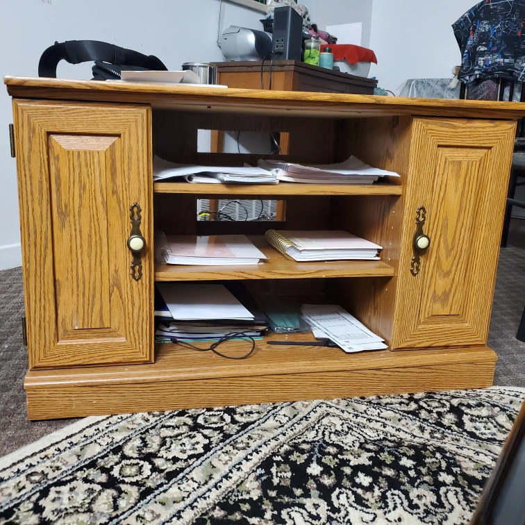 Solid wood TV stand. Changing the house up so no longer needed. No contents included. This would be a 2 (strong) person lift and you'll need an SUV, truck or minivan. Pick up only.