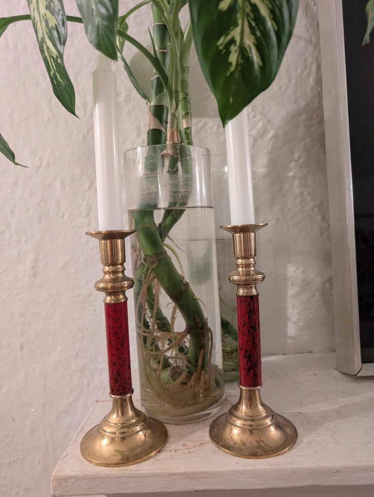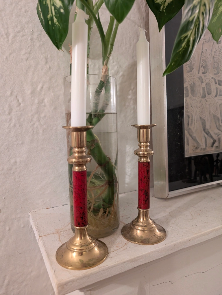 103Set of two brass candle holders. Red accents on the shafts. Classic design. Perfect for adding a touch of vintage elegance to your home décor. Candles not included.