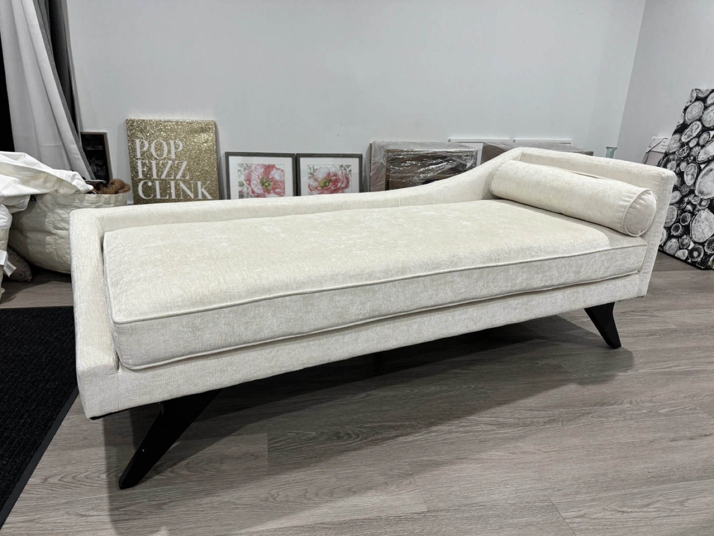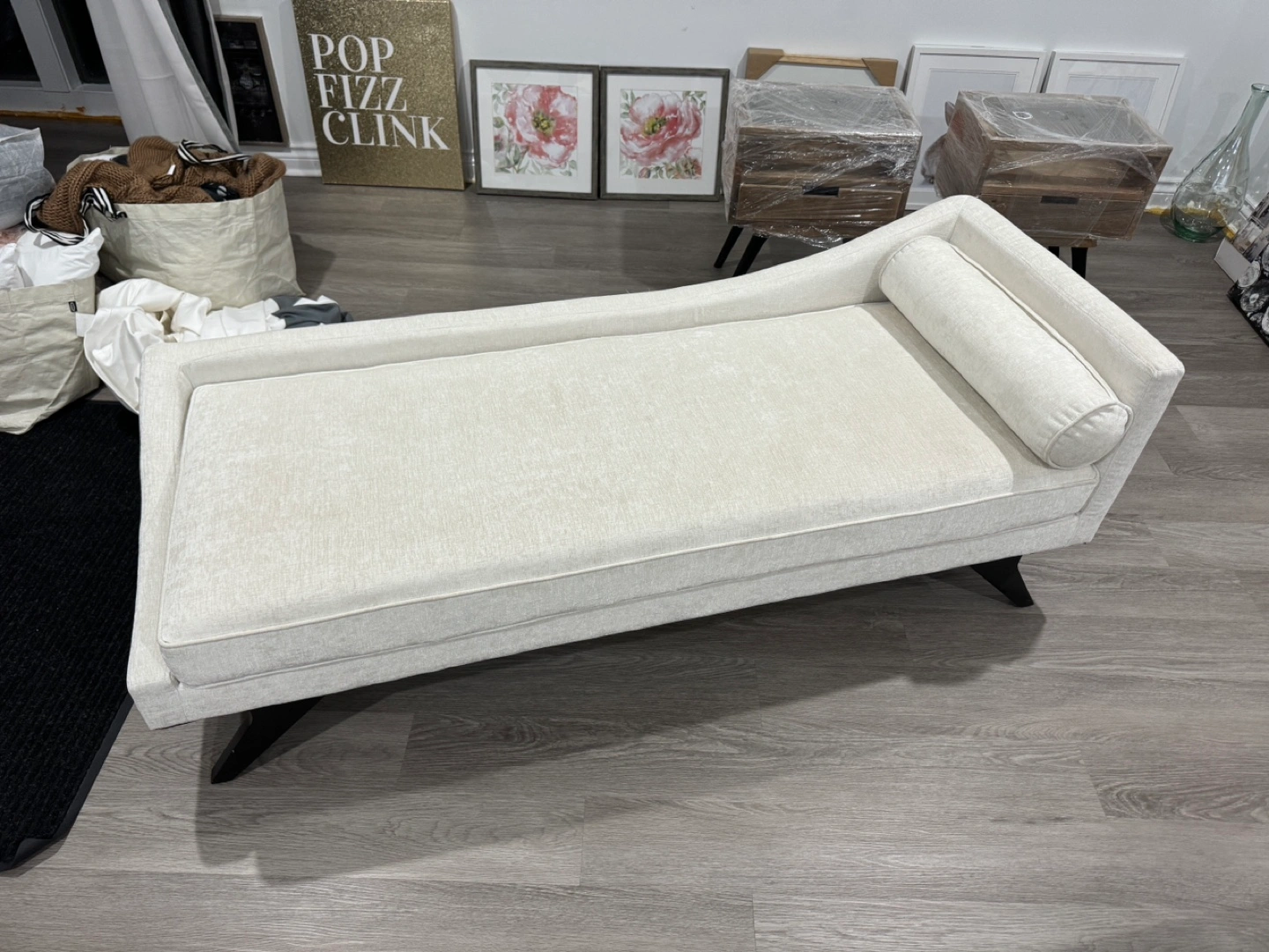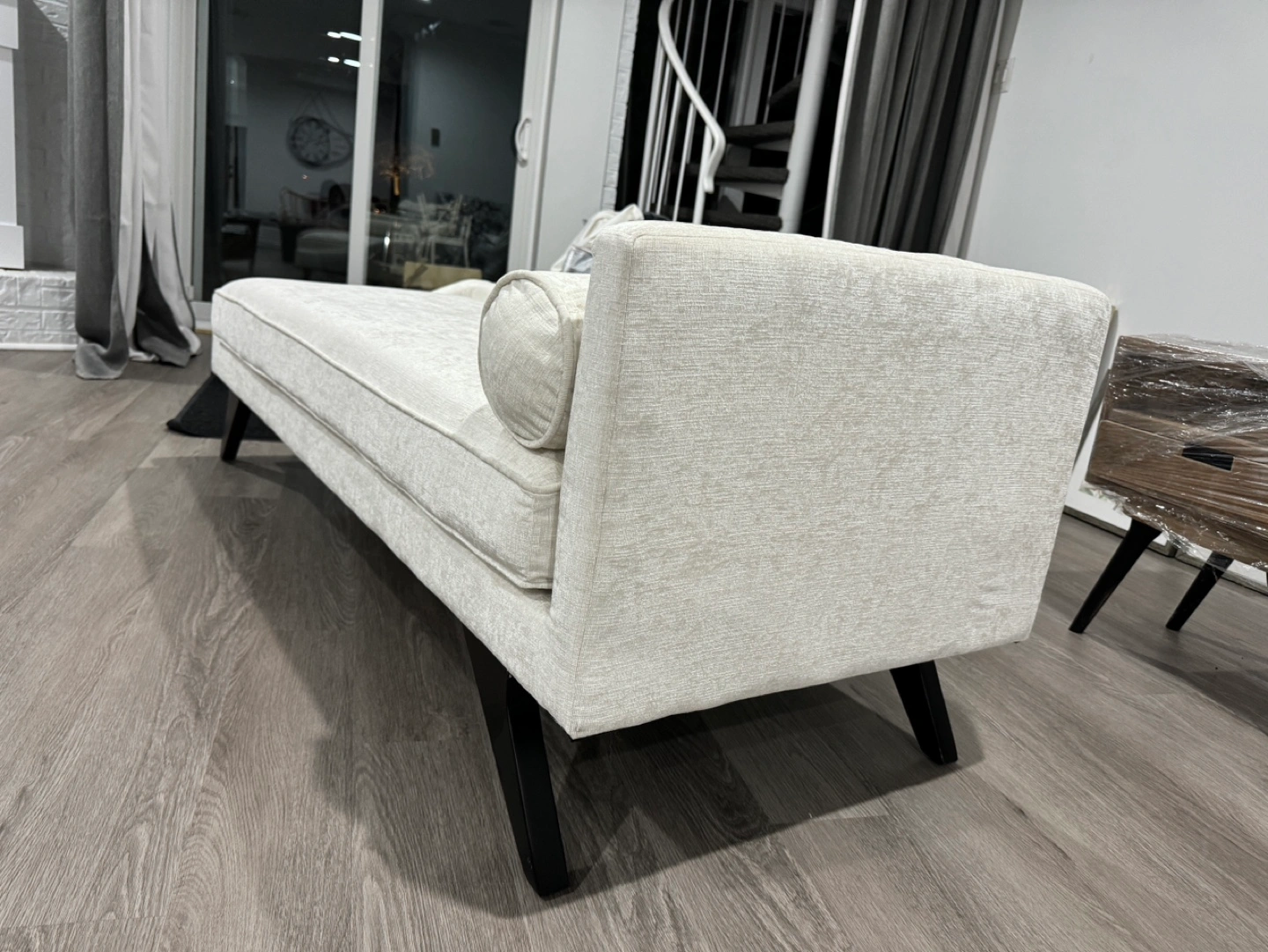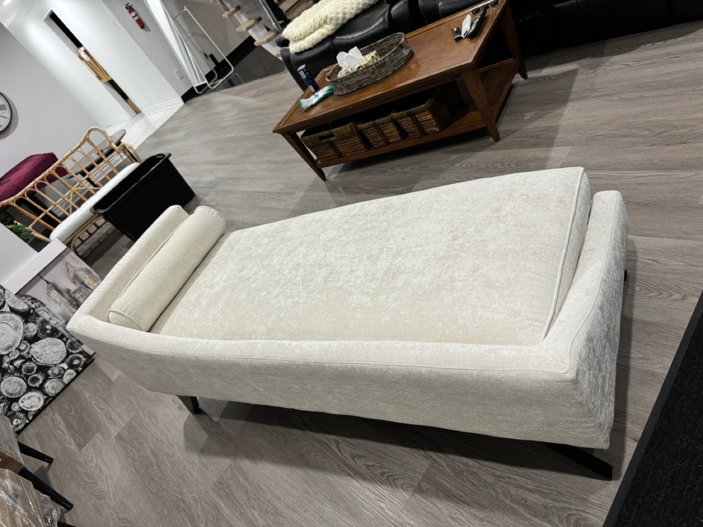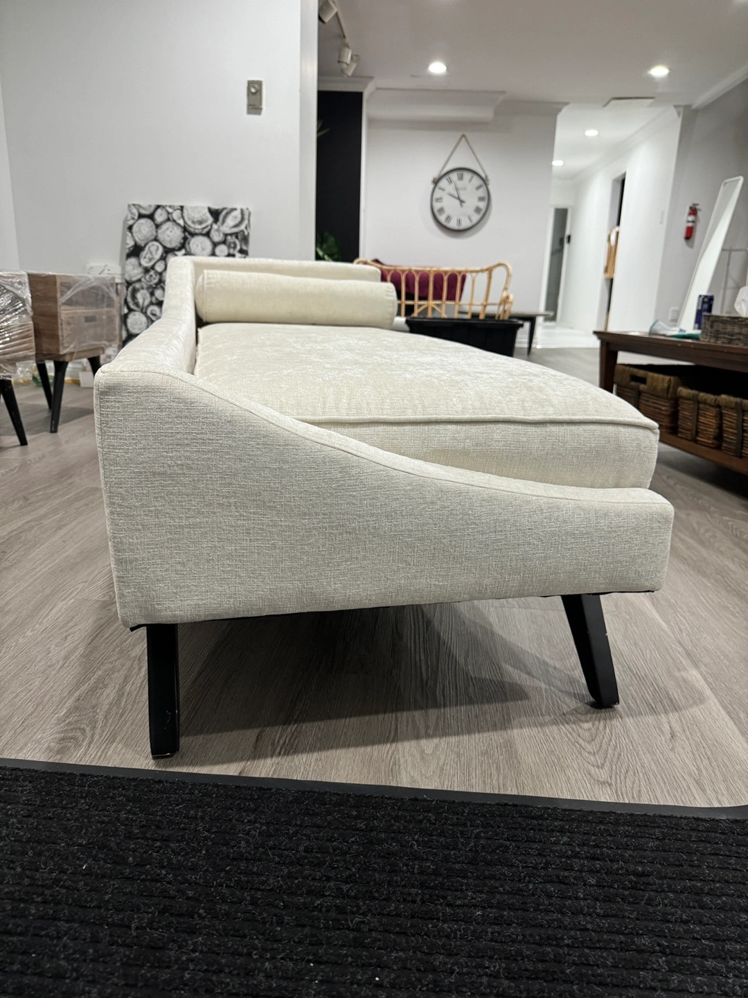 Off-white fabric chaise lounge. Black legs. Includes a bolster pillow. Stylish addition to any living space.
