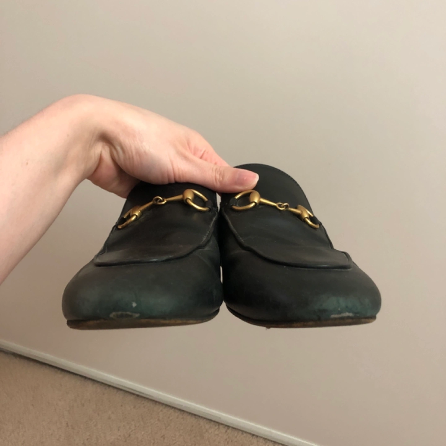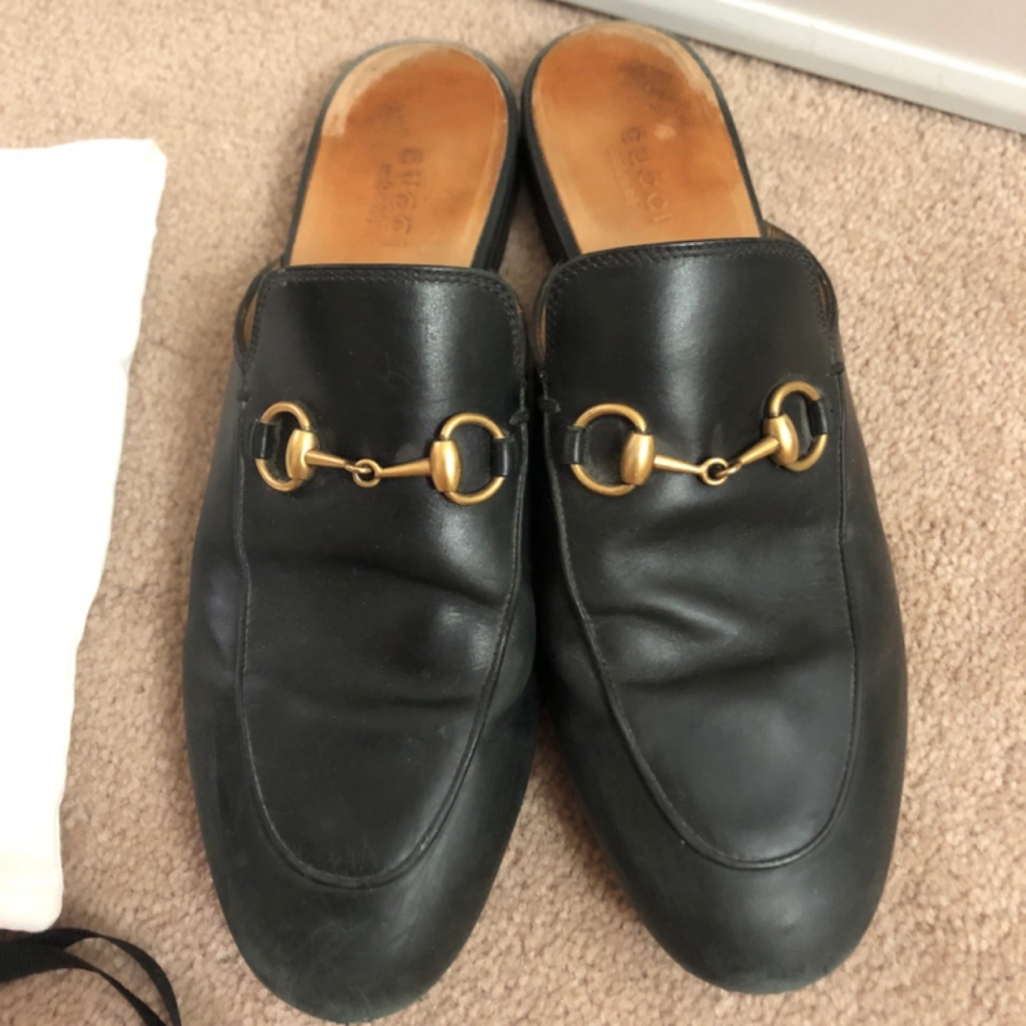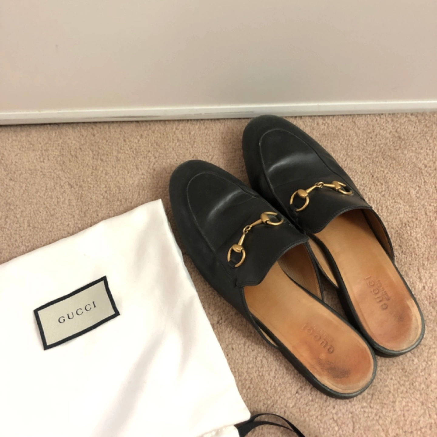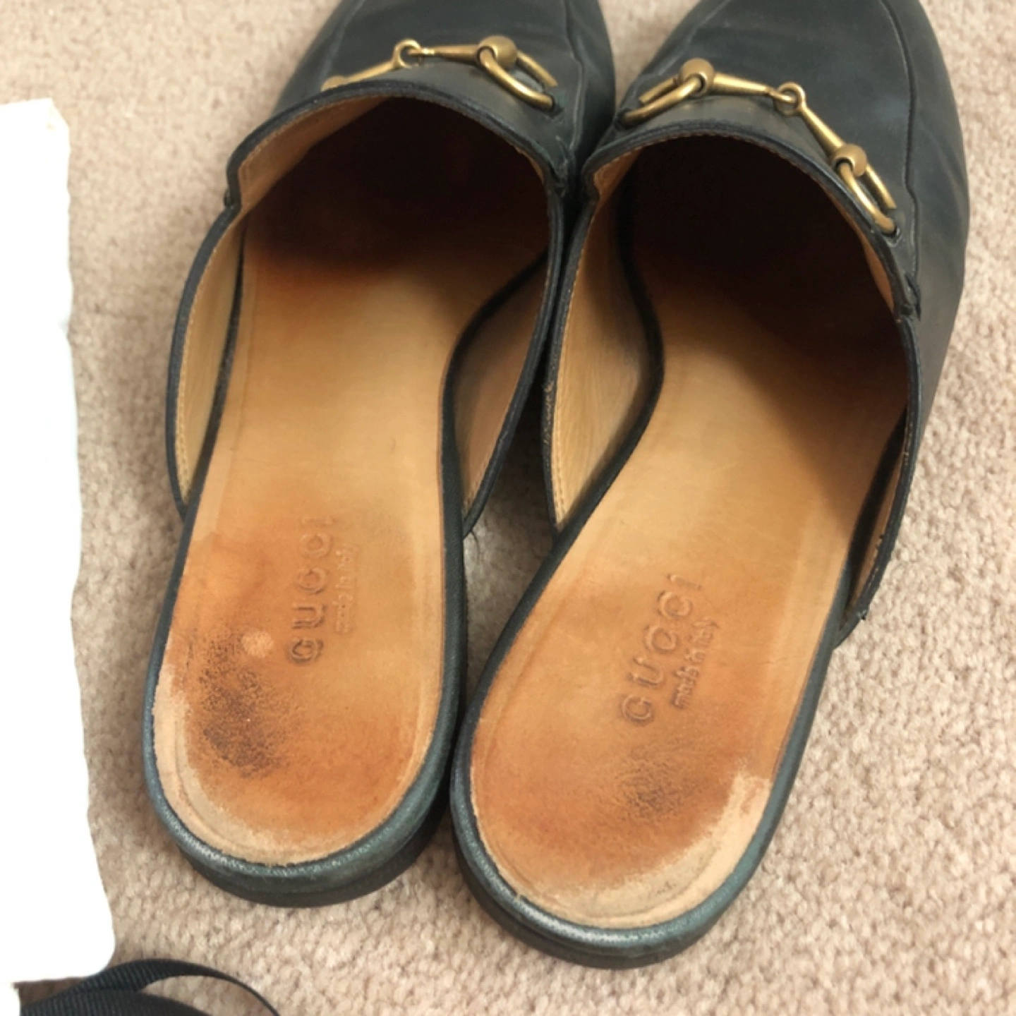 Pre-owned Gucci black leather mules. Gold horsebit detail.