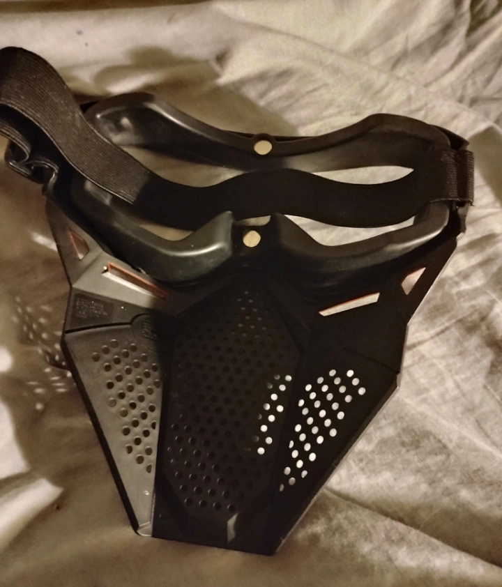 Full face mask, black and red. Protective eyewear included. Adjustable strap. Good for paintball or airsoft.