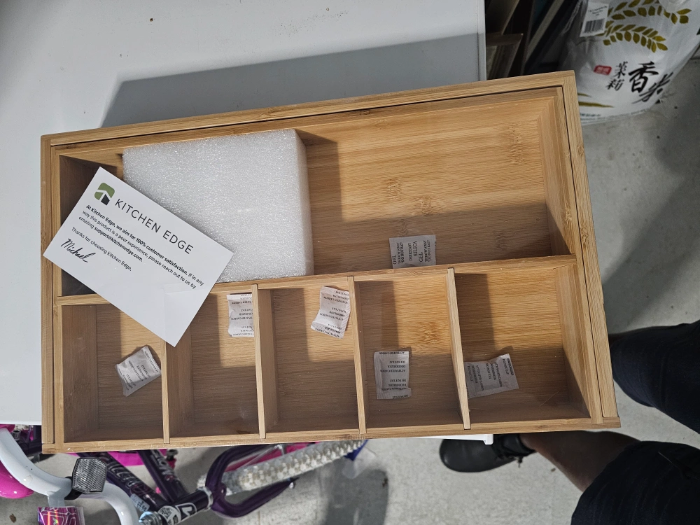 106New bamboo kitchen organiser. Multiple compartments. Includes a note from Kitchen Edge.