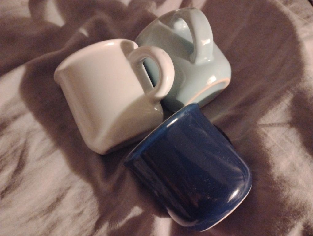 Three mini mugs, colours: light blue, dark blue, and white. Small size, perfect for espresso or dessert.