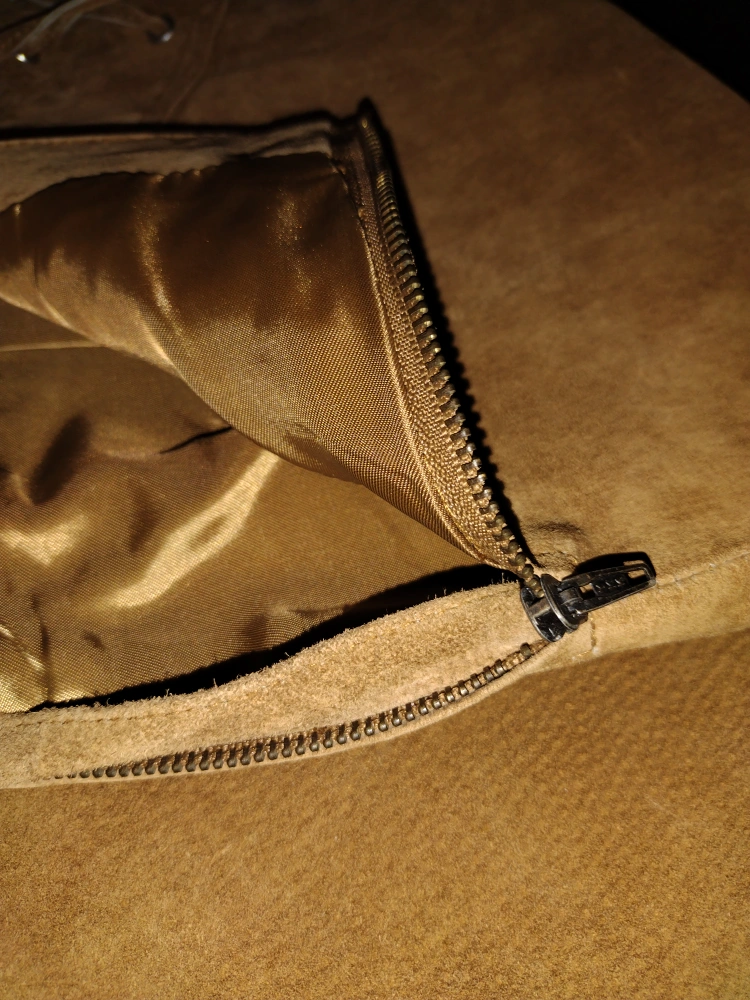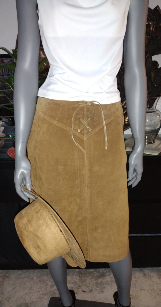 Brown suede A-line skirt. Lace-up detail at the waist. Medium size. Vintage, New condition with damaged zipper.