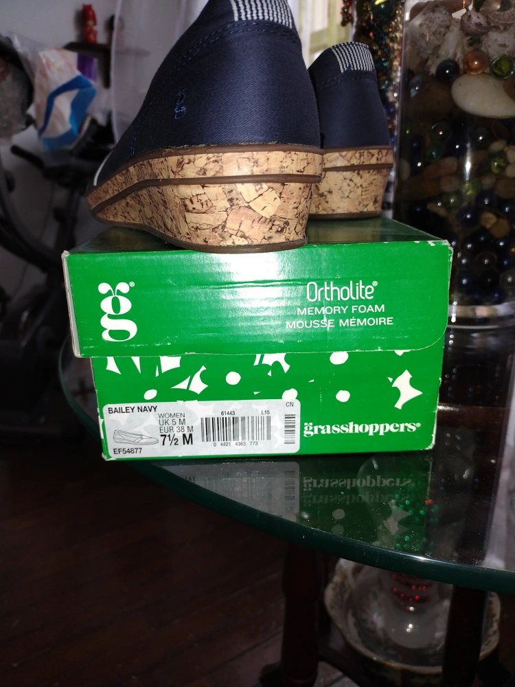 New Grasshoppers women's slip-on shoes. Navy blue canvas upper, cork wedge sole. In original box.