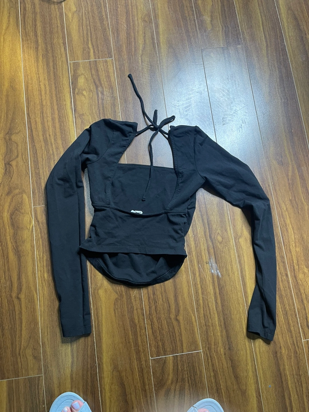 Form-fitting black crop top. Features long sleeves and a tie-back detail at the neckline. Great for layering or wearing on its own.