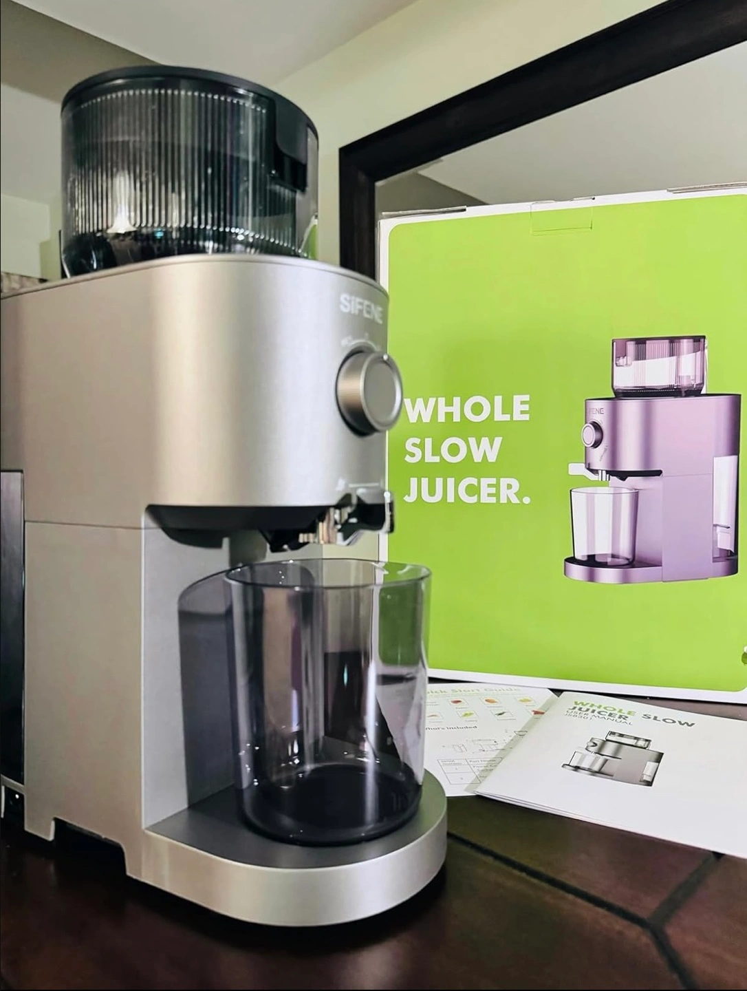 Innovative All-in-One Slow Masticating Juicer — This juicer integrates the juice cup and pulp container into the main unit, breaking away from traditional designs. With a wide feed chute and a large 1.2L pulp bin, it still maintains a compact size, saves counter space, and makes both use and storage more convenient in your kitchen