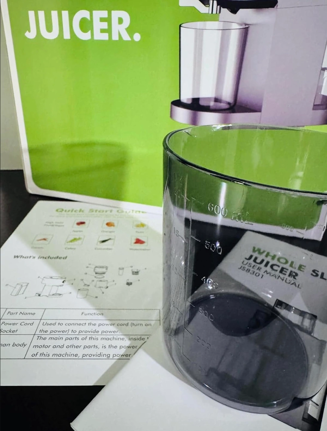 Safety Lock and Non-BPA Materials — Safety is our top priority. The juicer is equipped with a safety lock that stops operation as soon as the lid is opened, preventing accidental injuries to children or your hands. Made with Non-BPA materials, it ensures safe use for you and your family, providing peace of mind with every use