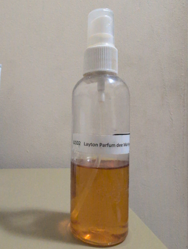 Layton Parfum de Marley perfume sample in a clear plastic bottle with a spray top. Partially full. Labeled U102.
