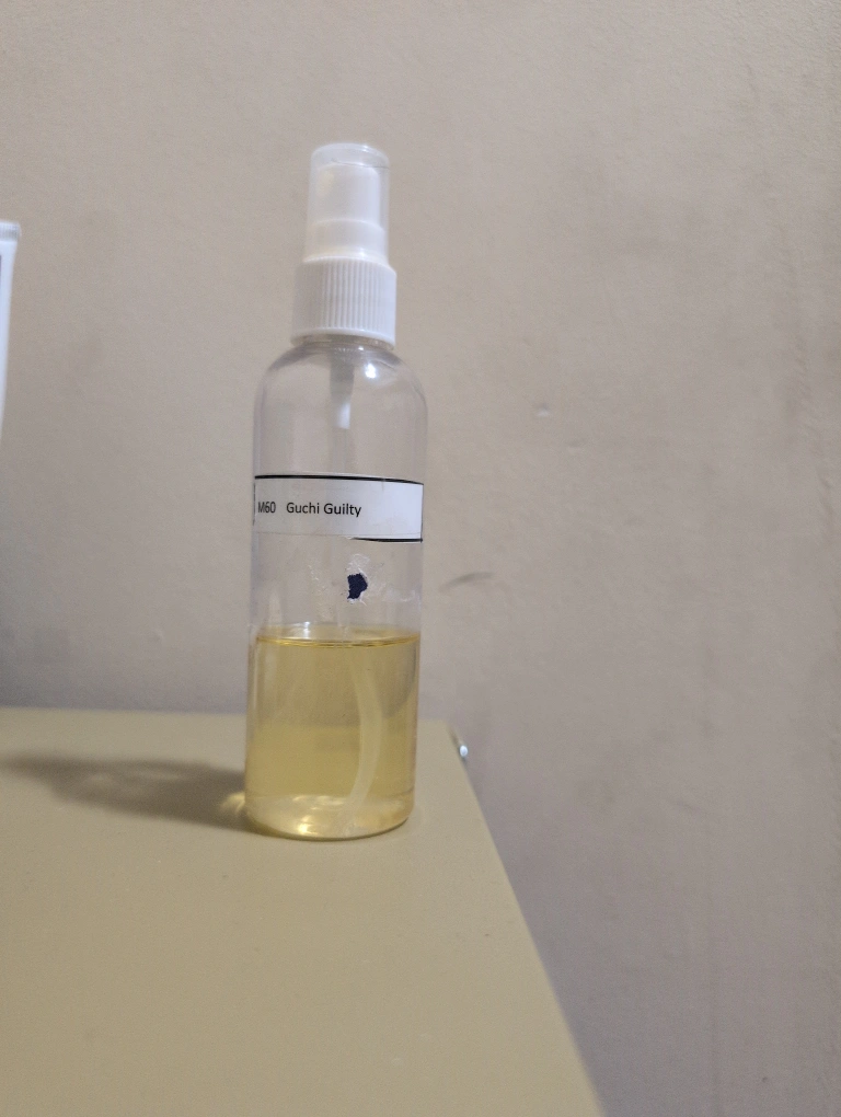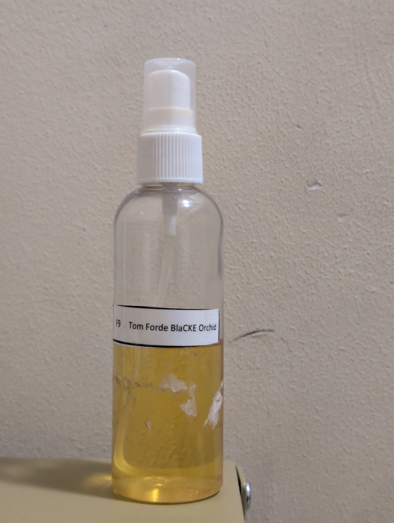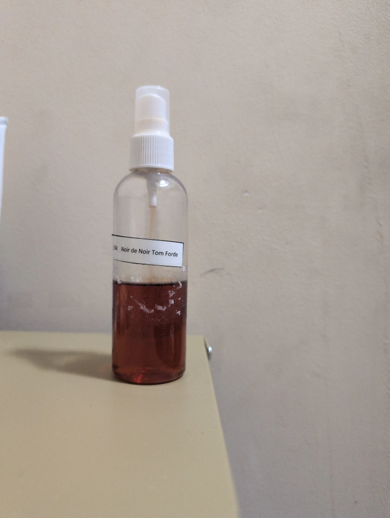 Three perfume samples in spray bottles. Gucci Guilty, Tom Ford Noir de Noir, and Tom Ford Black Orchid. Small bottles, ideal for travel or testing.