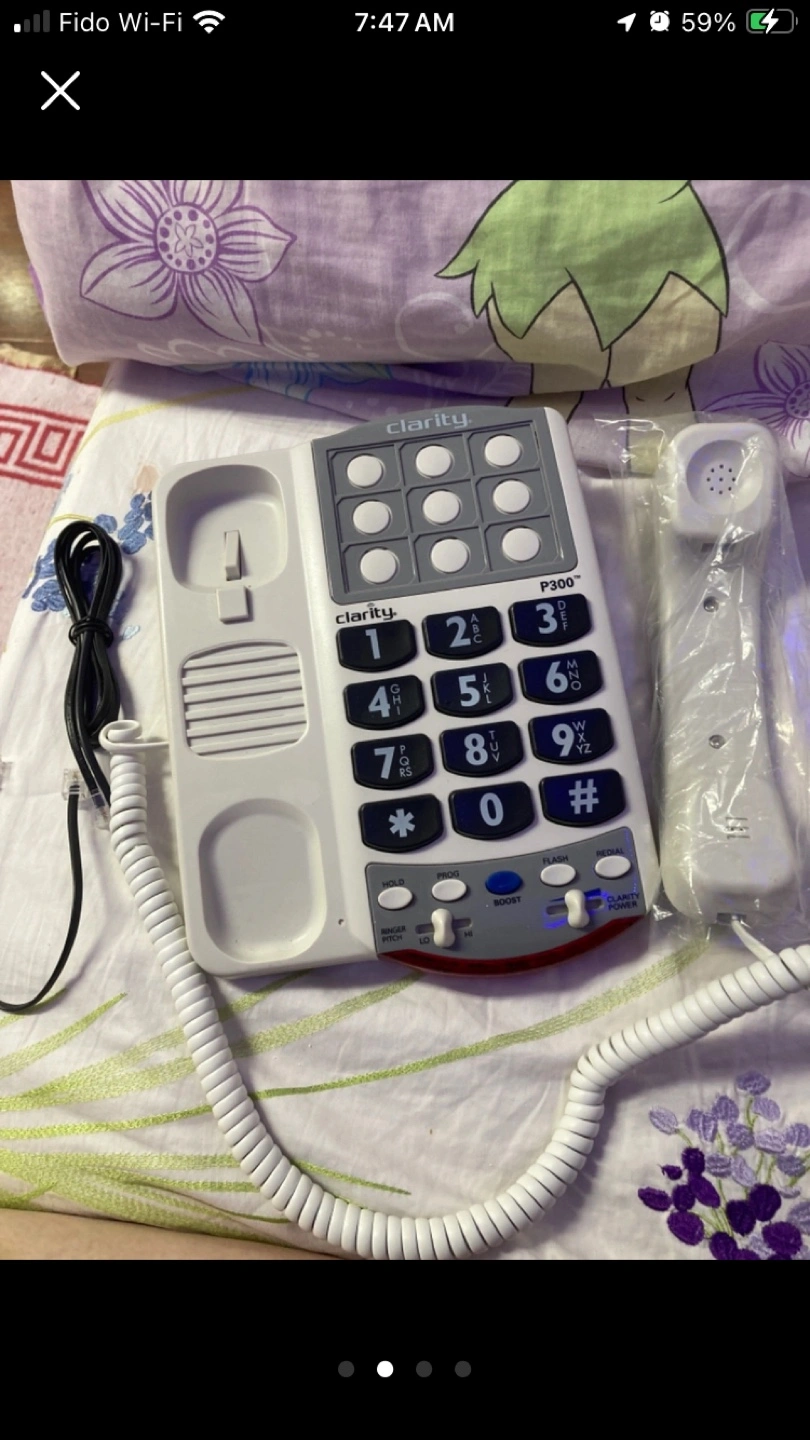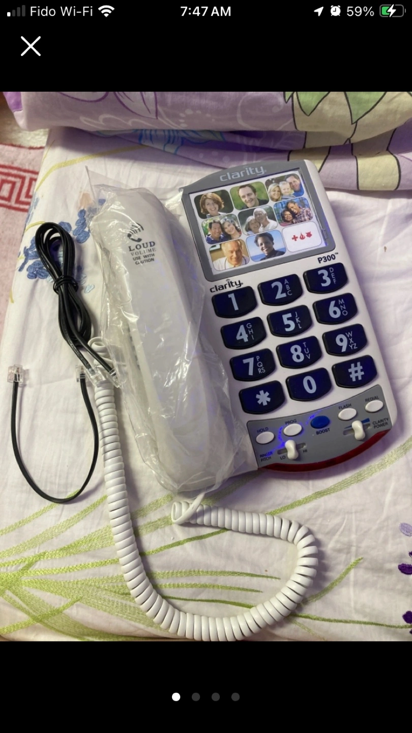 Corded phone with large buttons and photo slots. Features include volume control and a memory function. Excellent for seniors or those with vision impairment. ( slightly Used but in good condition).