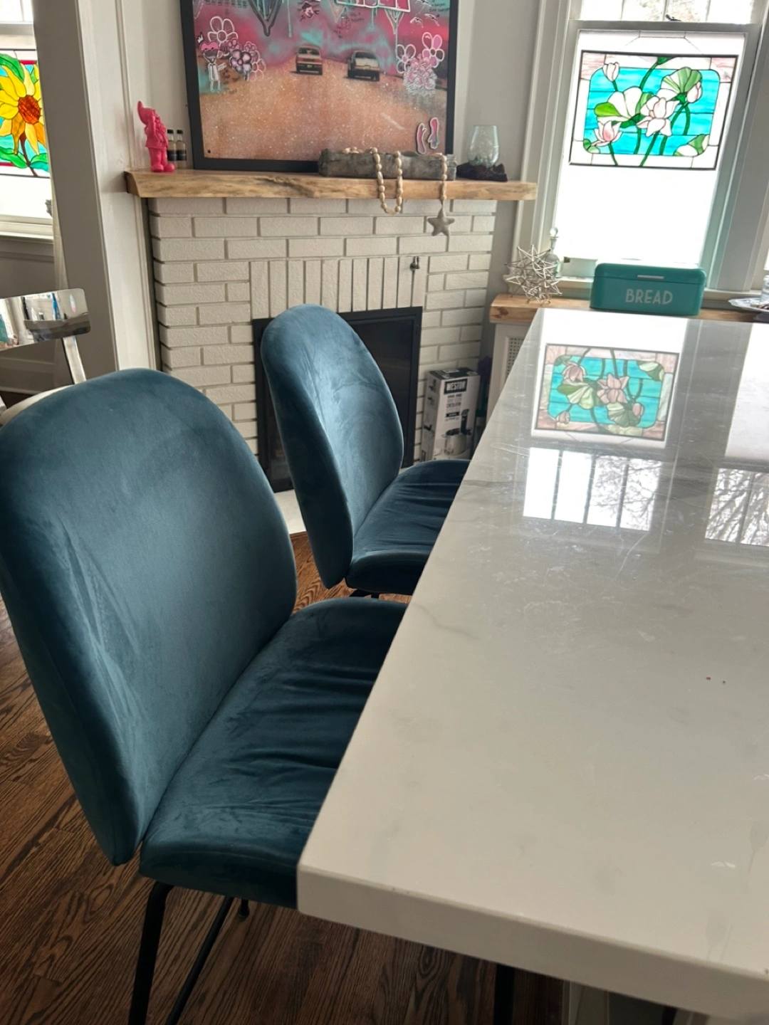 4 teal velvet counter stools. Black metal legs. Slight wear visible on the fabric. Modern design, ideal for kitchen island or bar. Price is for all 4