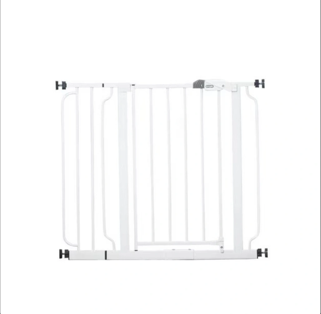 Sturdy, all-metal safety gate. Fits openings 29 to 39 inches wide by 31 inches high. Pressure mount assembly, no hardware required. Easy to use handle with walk-through door. Includes 6-inch wide extension kits. For ages 6 to 24 months. White.