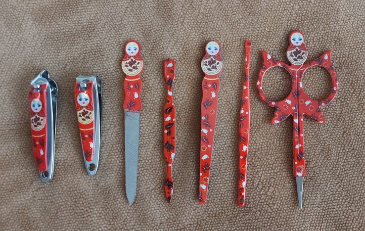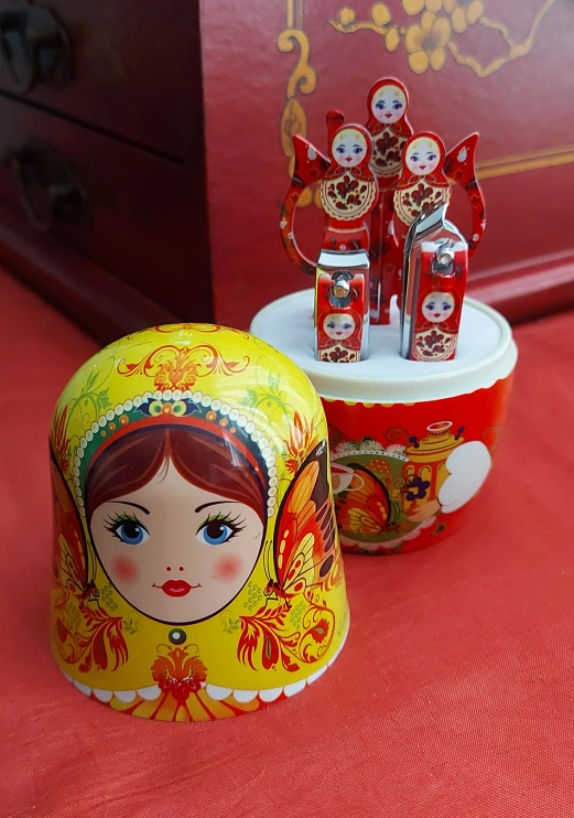 🆕Brand new. Cute Matryoshka-themed manicure set. Includes nail clippers, cuticle pusher, nail file, tweezers, and small scissors. All tools stored in a decorative nesting doll container. Perfect gift.