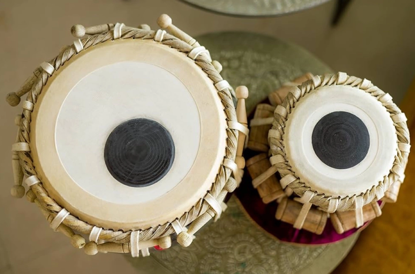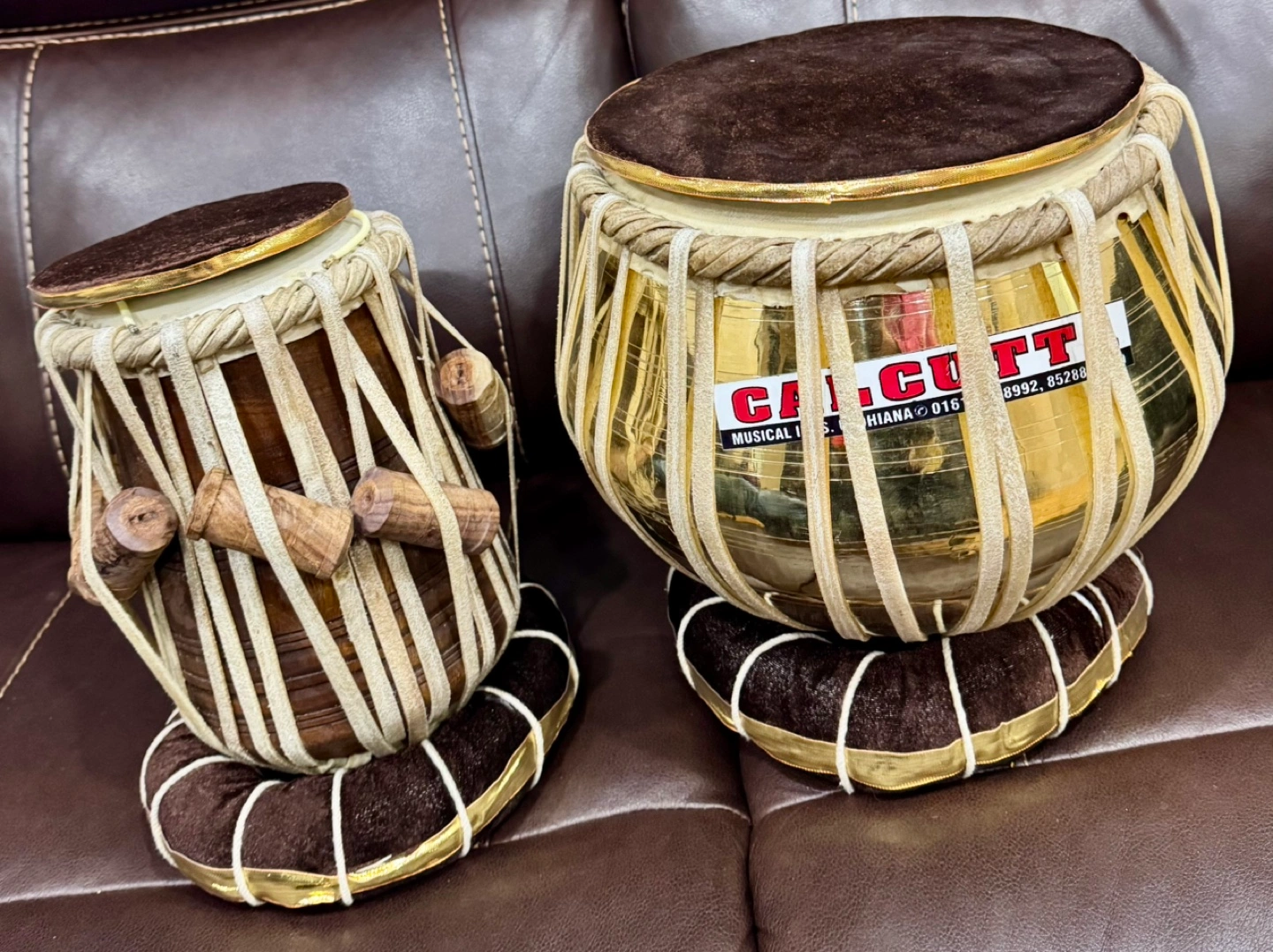 Set of two tabla drums. One larger, one smaller. Wooden and metallic bodies. Includes mallets. Great for musical practice or performance.