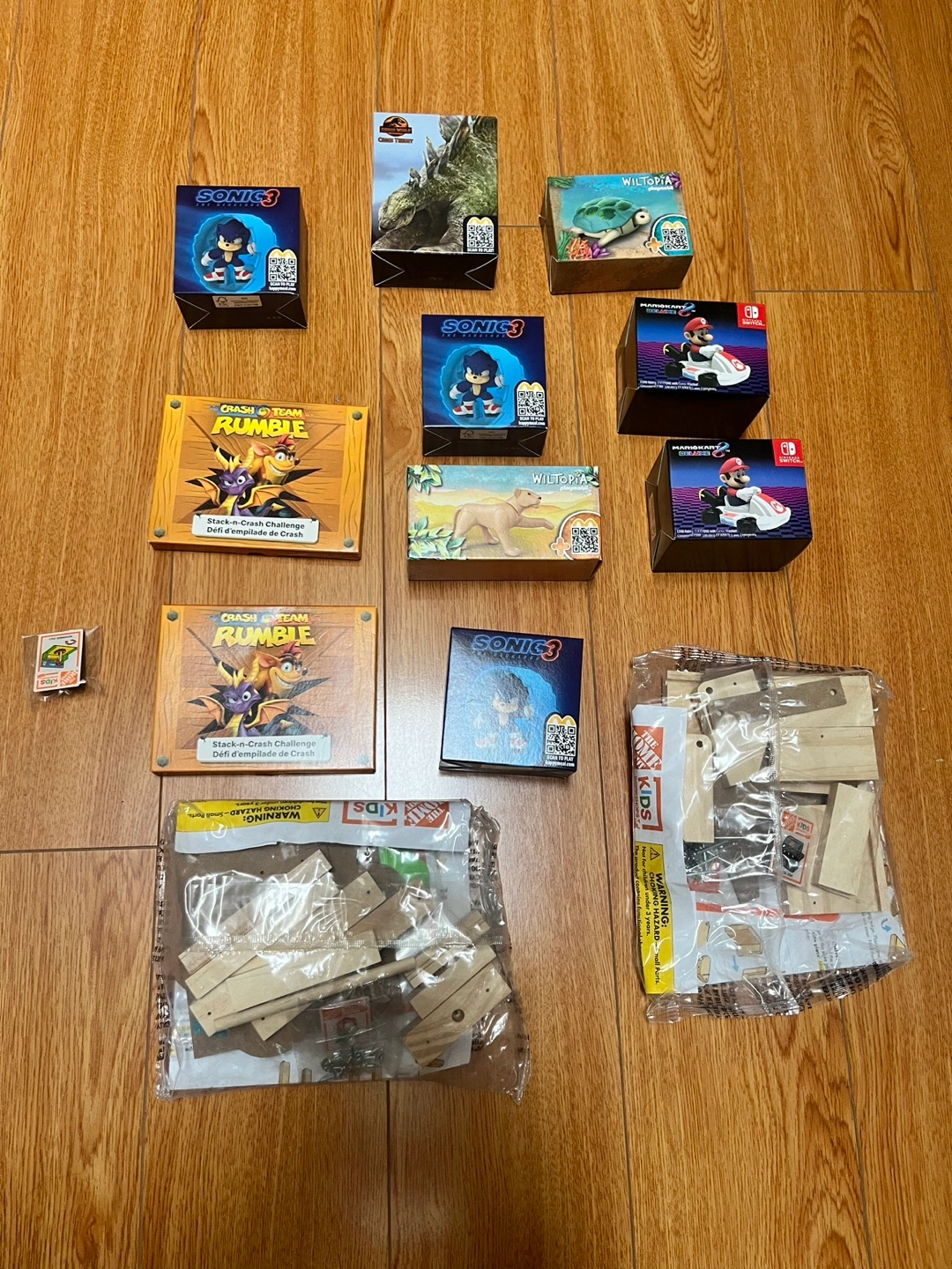 Collection of McDonald's Happy Meal toys. Includes Sonic the Hedgehog, Crash Bandicoot, Mario Kart, and Wiltopia figurines. Also, a wooden craft kit is included. All items are in boxes or packaging. Perfect for collectors or kids.