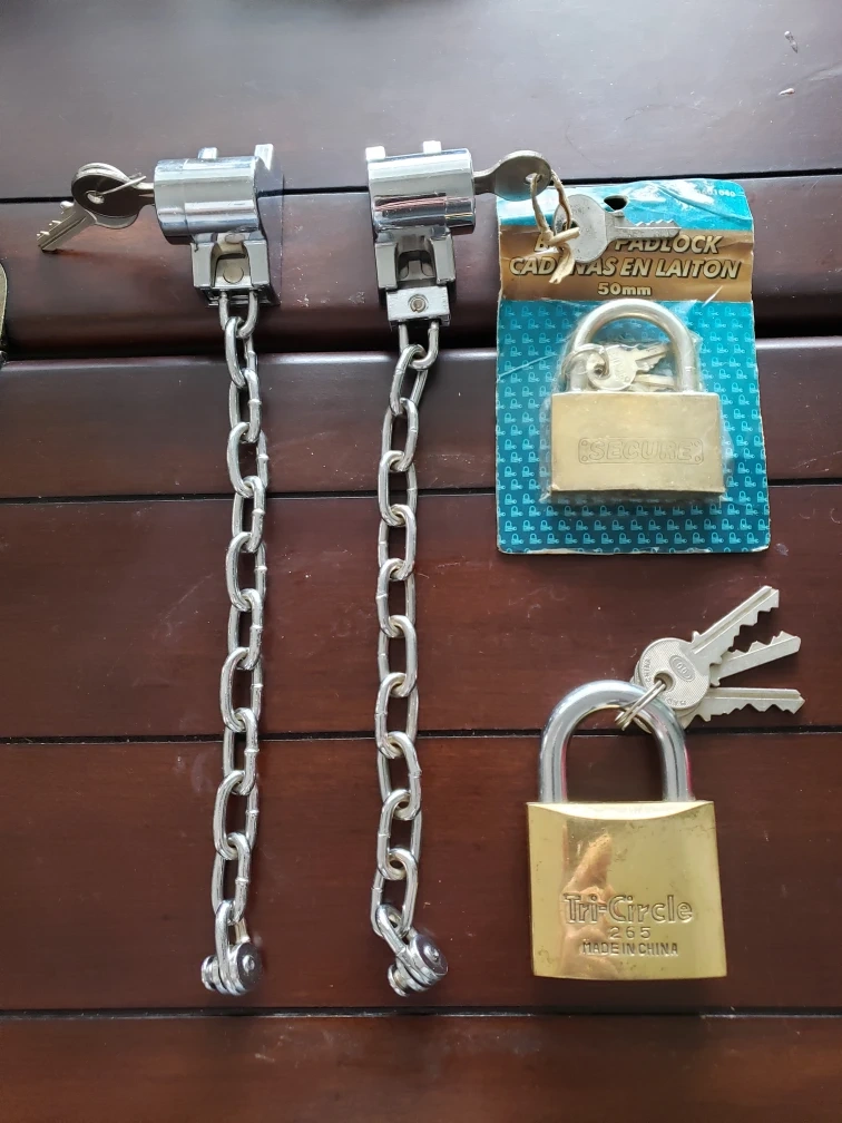 1000+Two chrome-plated hasp and chain locks. Includes two padlocks; one brass Secure brand padlock and one Tri-Circle brand padlock. Keys included.