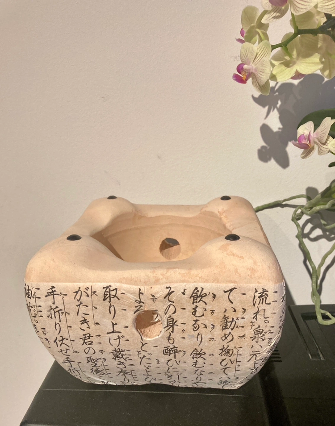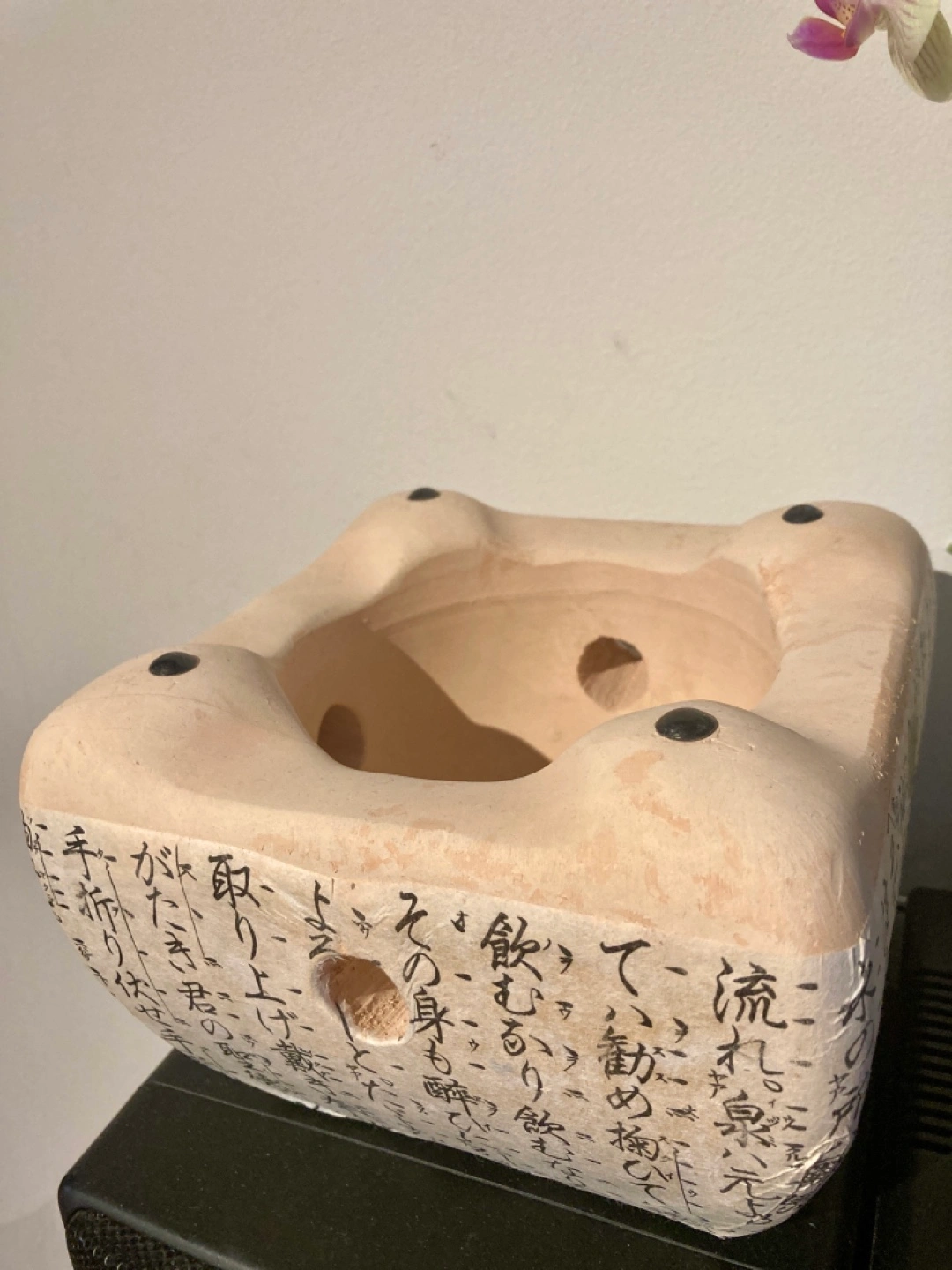 Tabletop hibachi grill. Features Japanese characters. Made of diatomaceous earth. Small and portable.