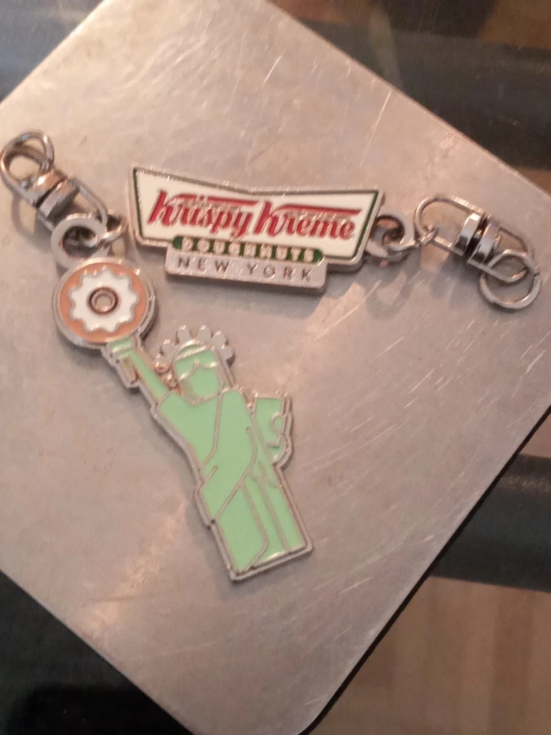 Collectible keychain bits featuring Krispy Kreme and Statue of Liberty designs. Metal construction. Great for fans of Krispy Kreme doughnuts and New York City.