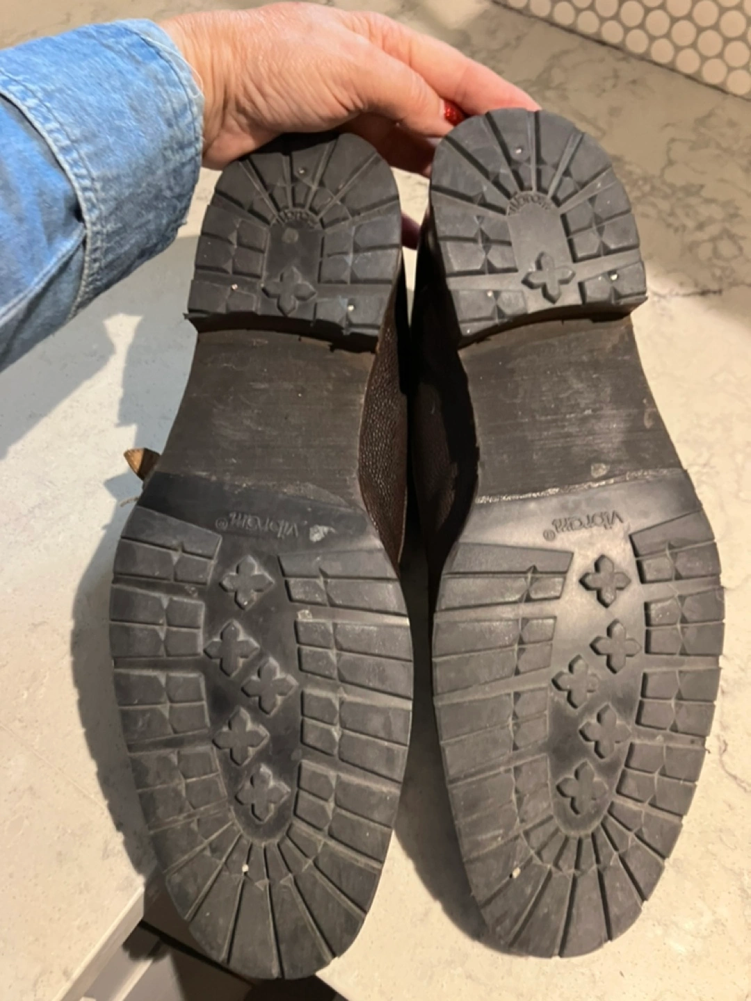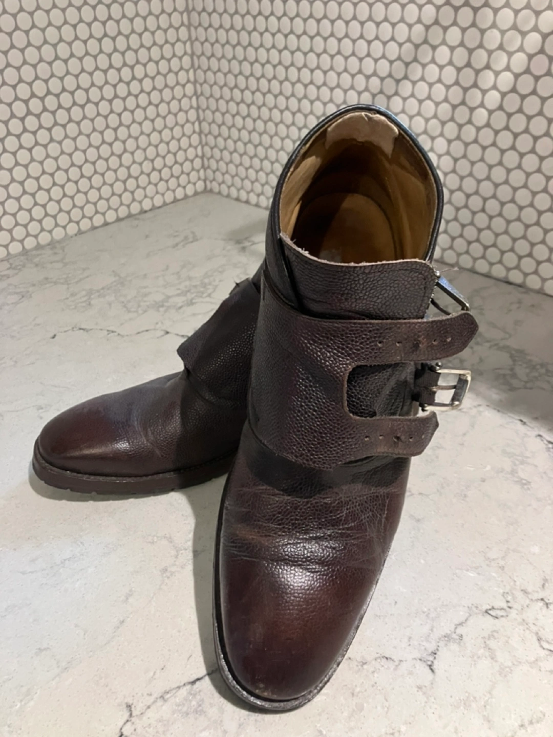 Pre-owned men's brown leather ankle boots. Double buckle closure. Shows some wear. Good condition.