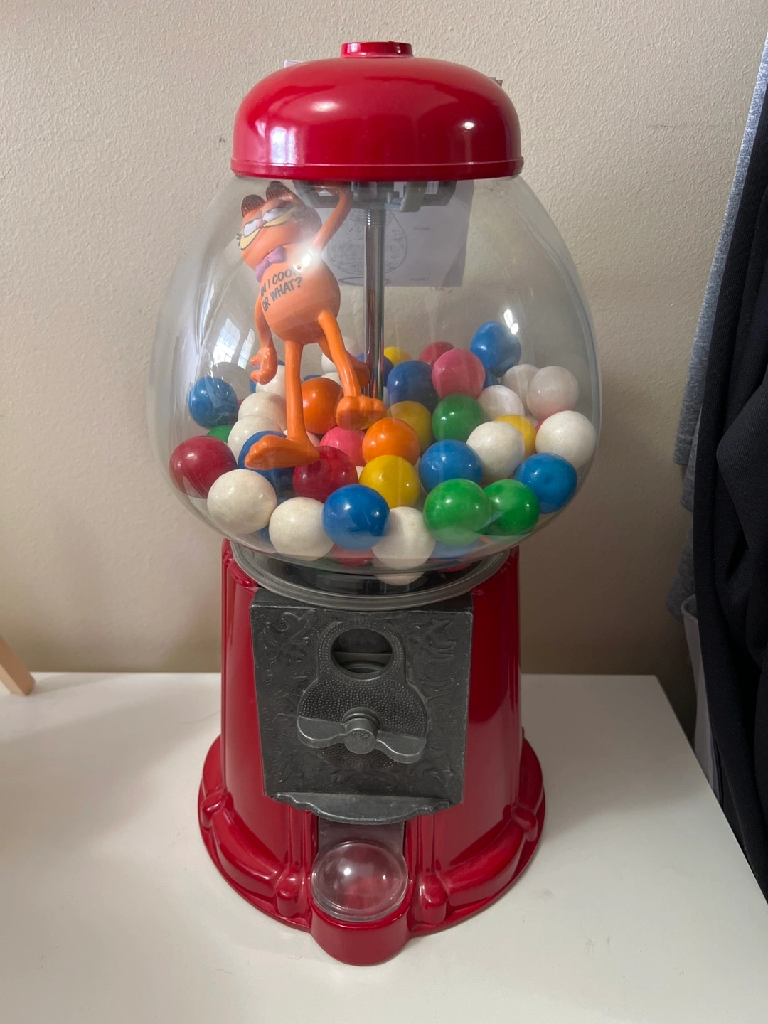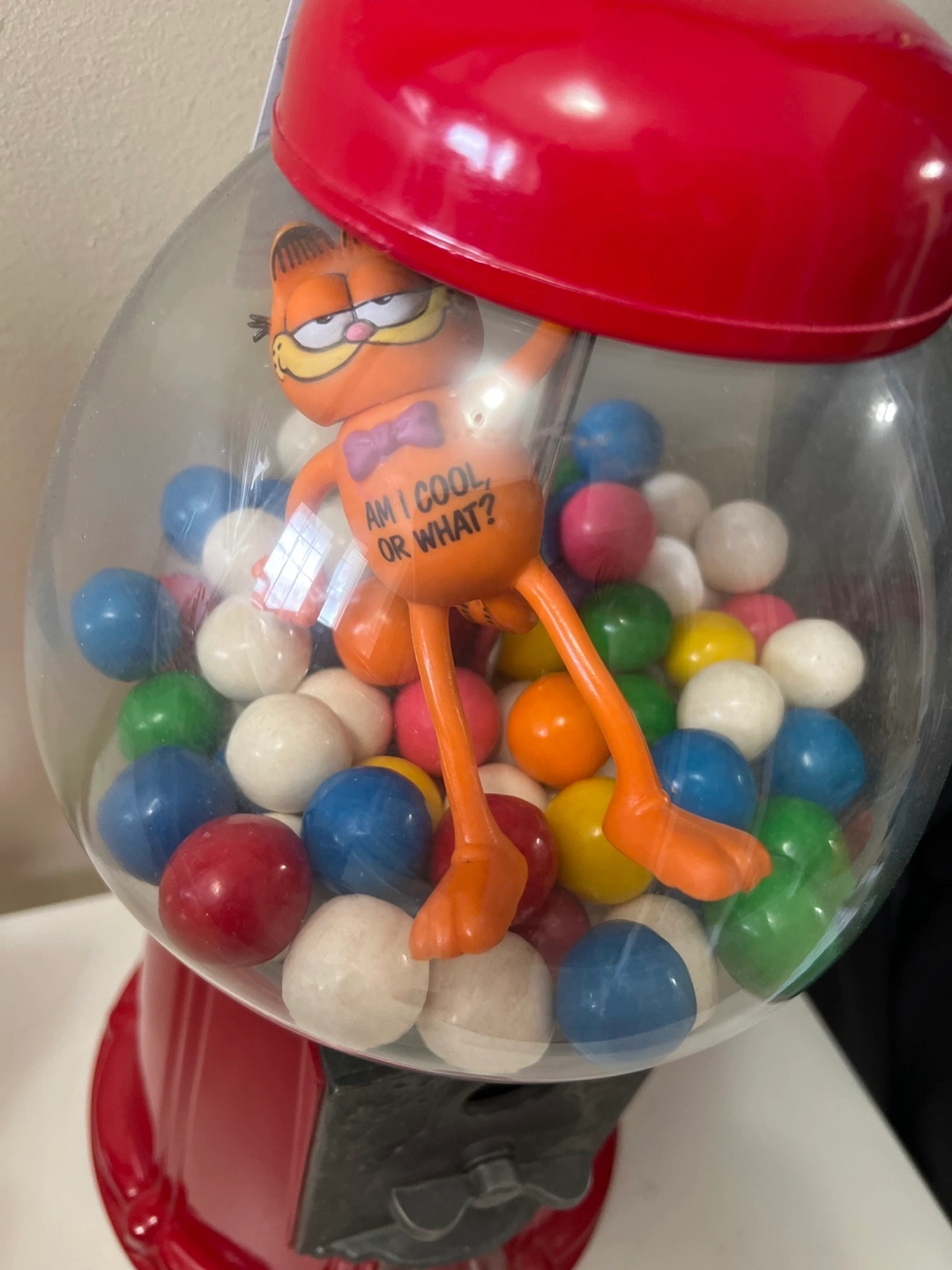 Vintage-style gumball machine. Features Garfield figurine inside. Filled with gumballs. Red and clear plastic construction. Collectible item.