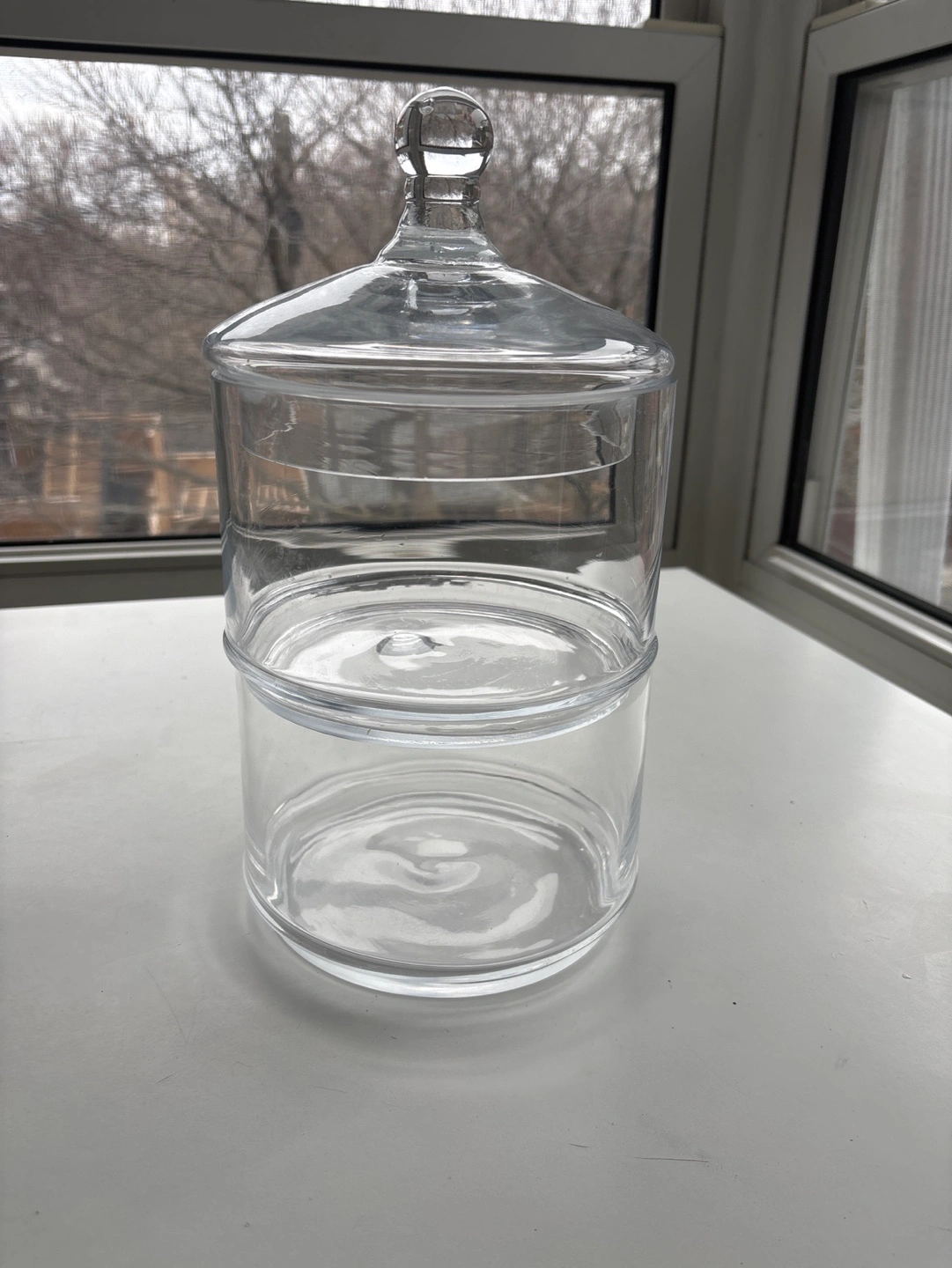 Elegant, clear glass server. Features two tiers and a dome lid. Perfect for candies, cookies, or other treats. Great for entertaining.