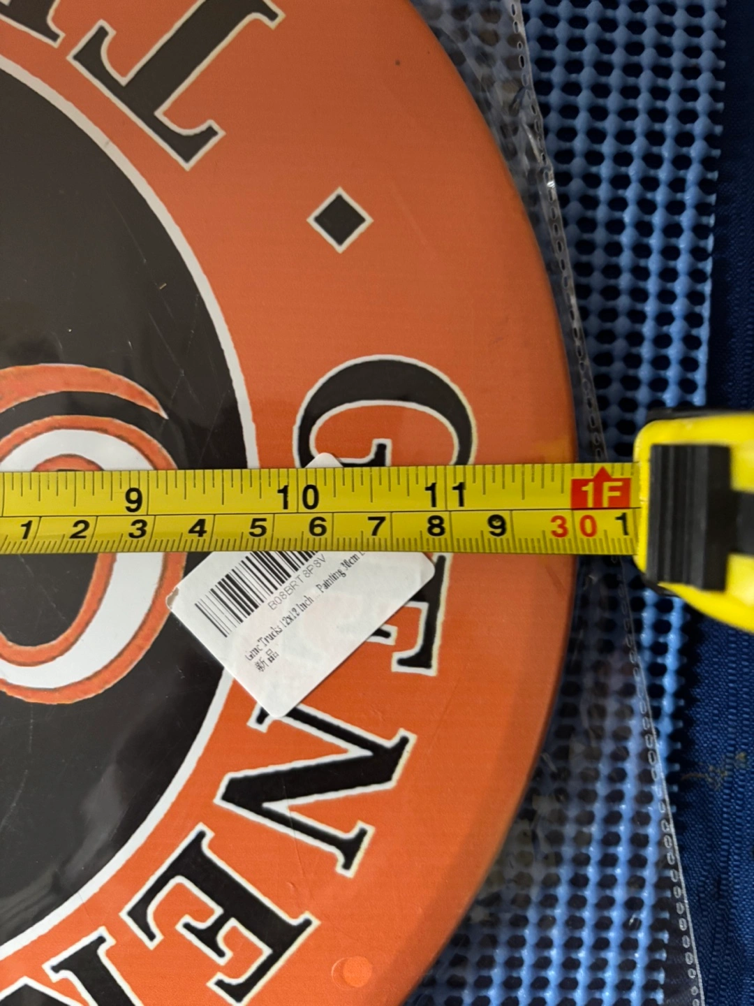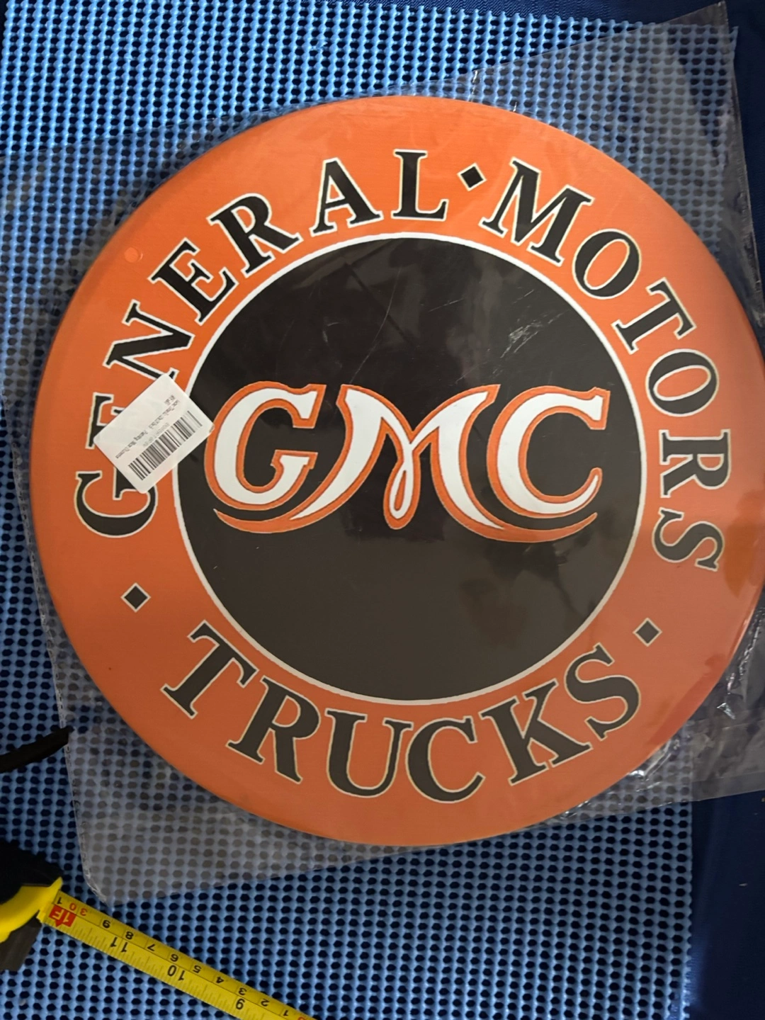 Round metal sign. Features the GMC logo. Orange and black colours. Approximately 12 inches in diameter. New, in plastic packaging.