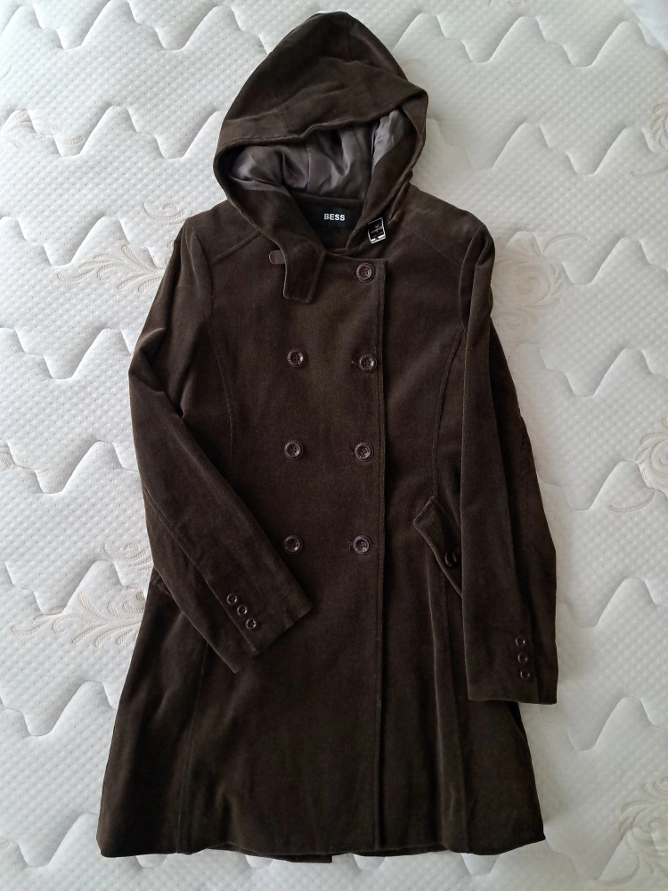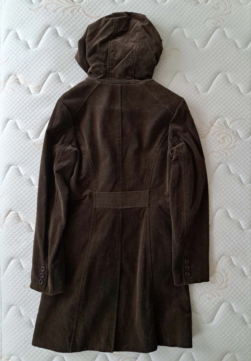 Women's brown corduroy coat. Double-breasted, hooded. 97% cotton, 3% spandex. Hand wash with similar colours.