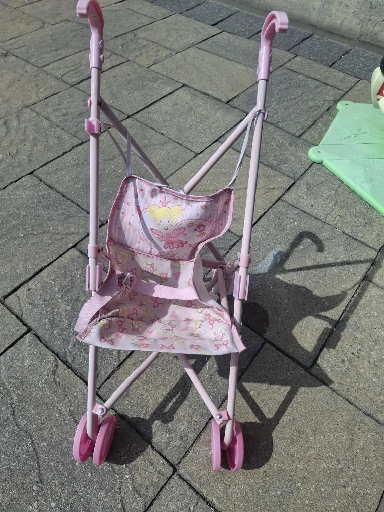 Adorable pink doll stroller. Features a fairy design. Collapsible design. Great for imaginative play.
