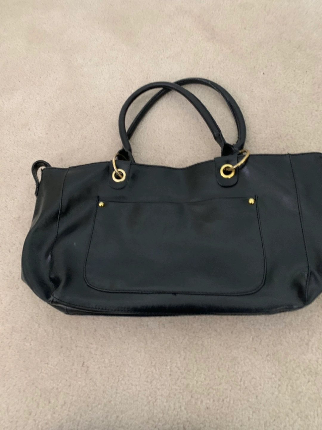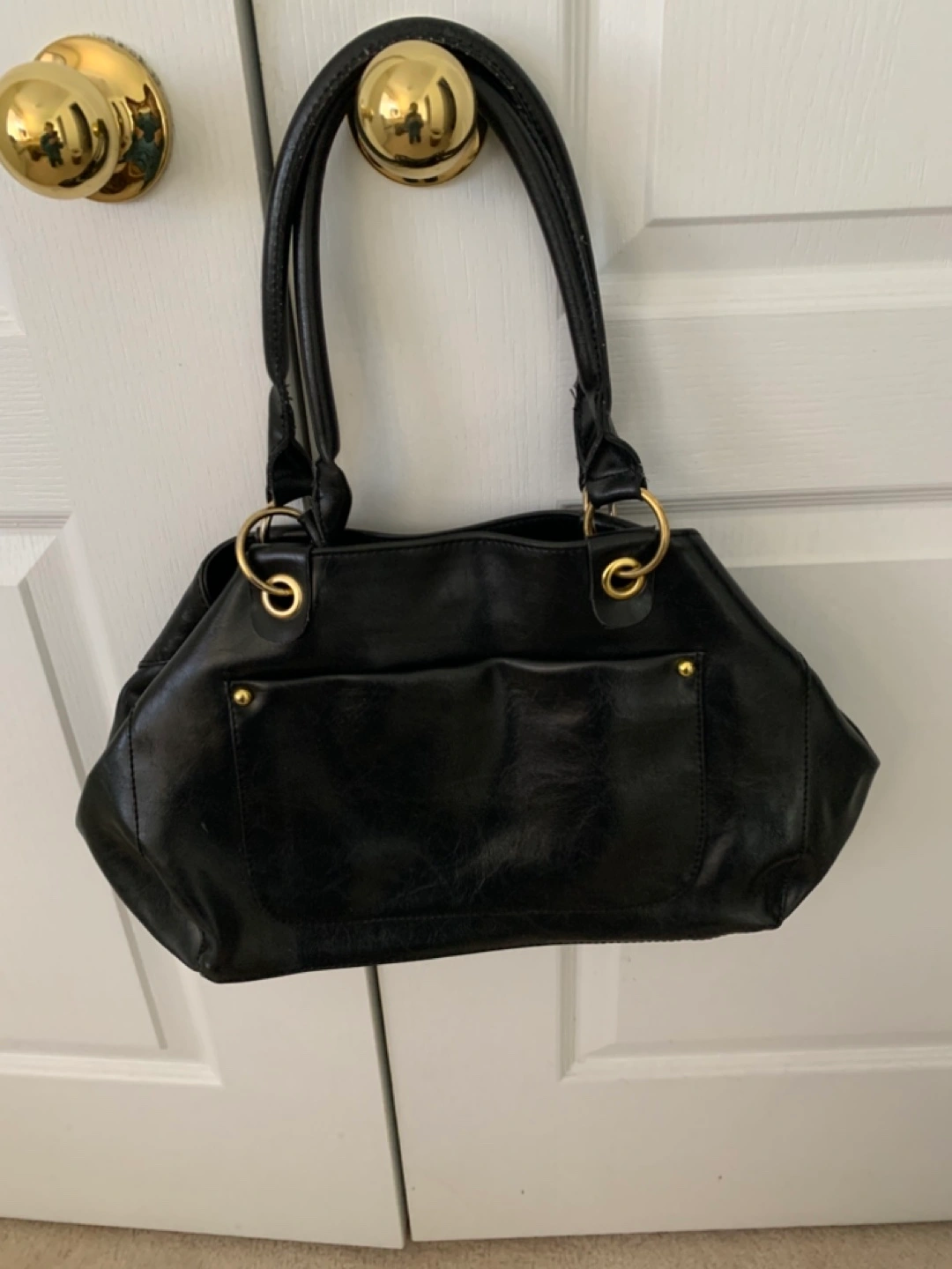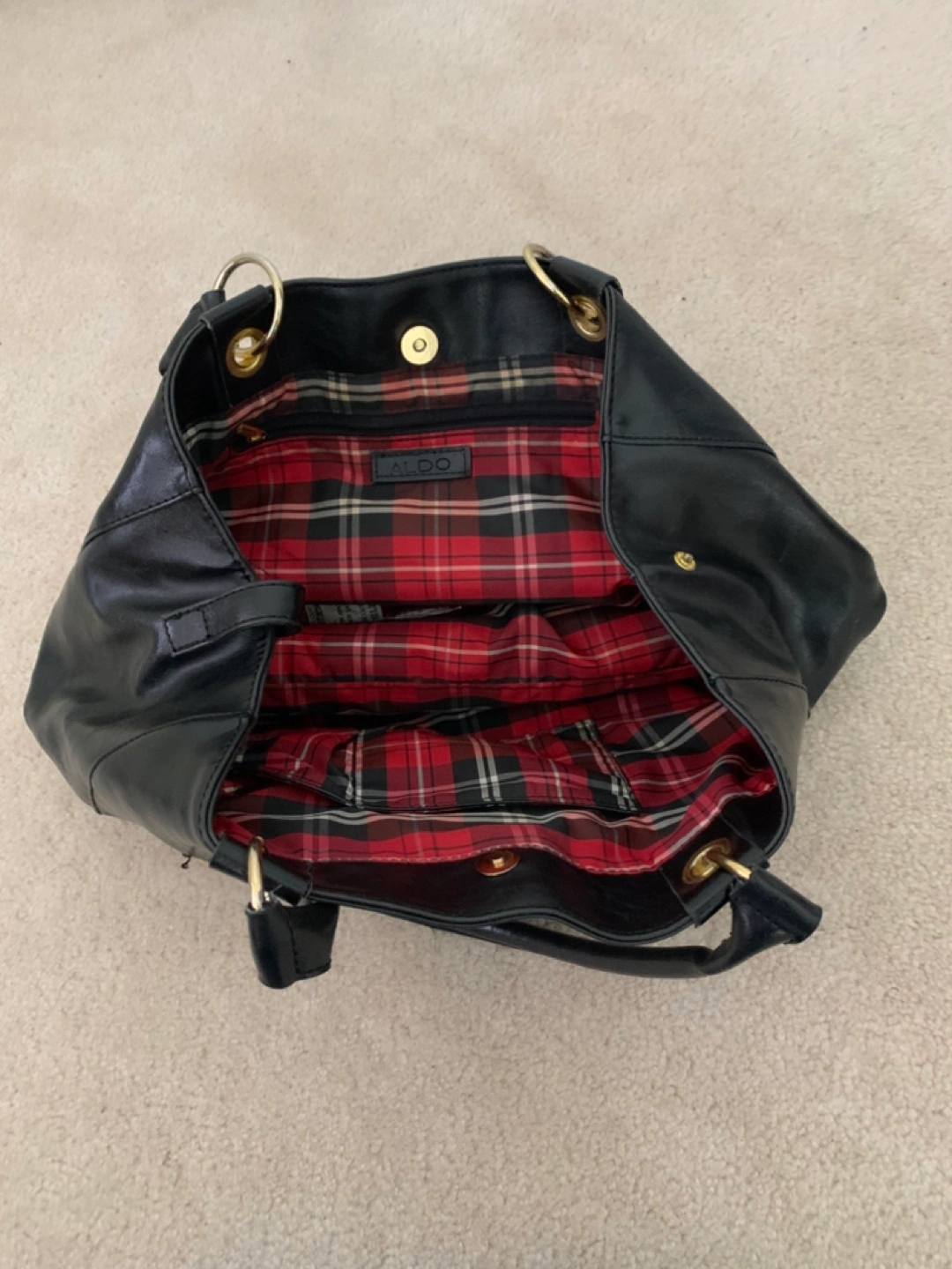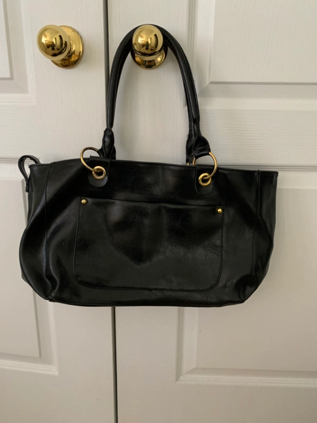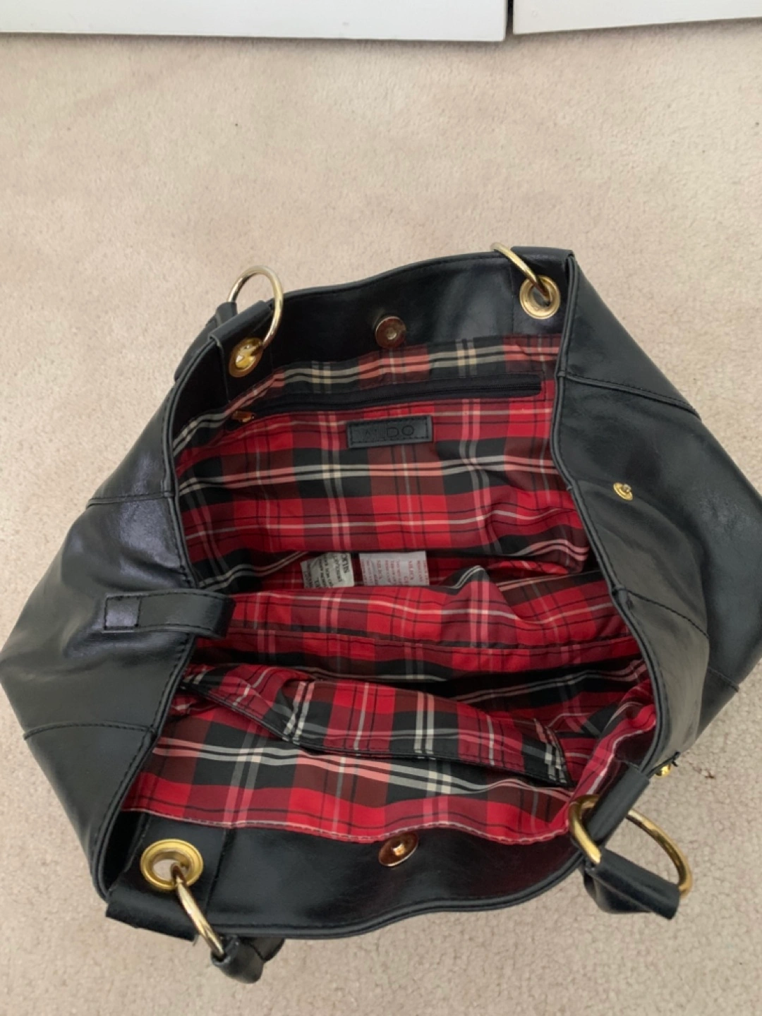 Black shoulder/tote bag. Features gold hardware and a plaid interior. Two top handles. Small front pocket. On both sides are foldable style and can be convertible to tote bag. Excellent condition.
