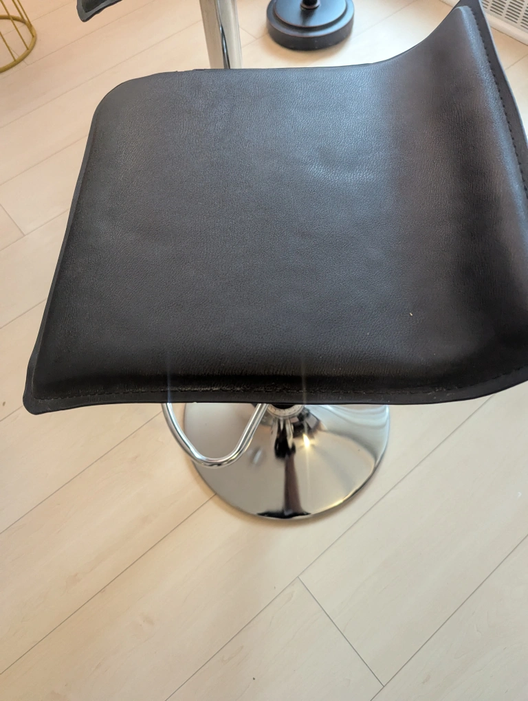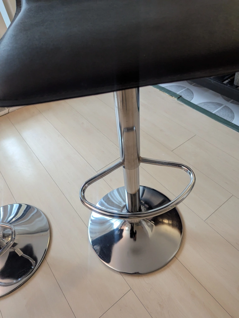 Two bar stools, black faux leather seats, chrome metal base and footrest. Adjustable height. Good used condition.