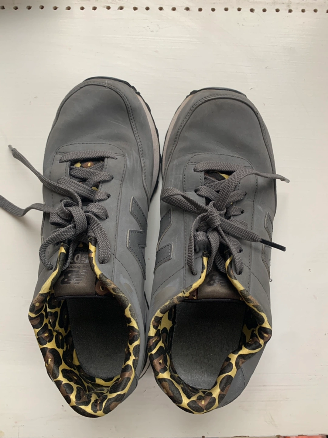 Grey suede New Balance 501 sneakers. Leopard print inner lining. Size 7.5 US. Pre-owned.