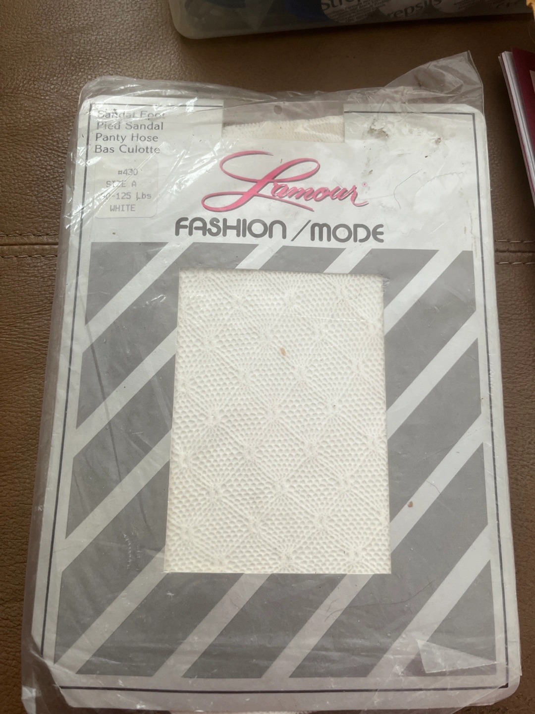 White lace pantyhose. Size A, fits up to 125 lbs. Sandal foot style. Vintage, new in package.