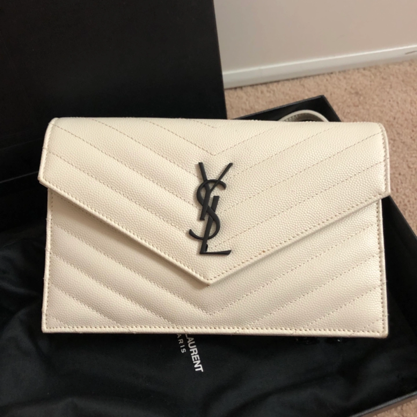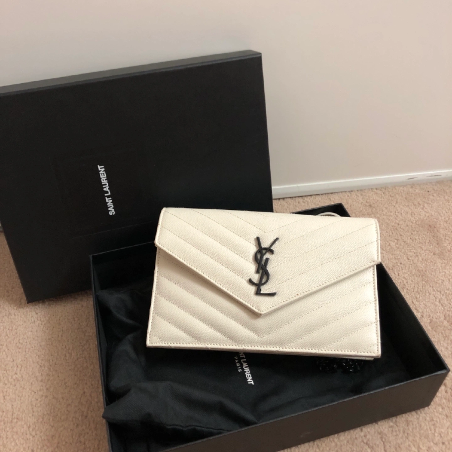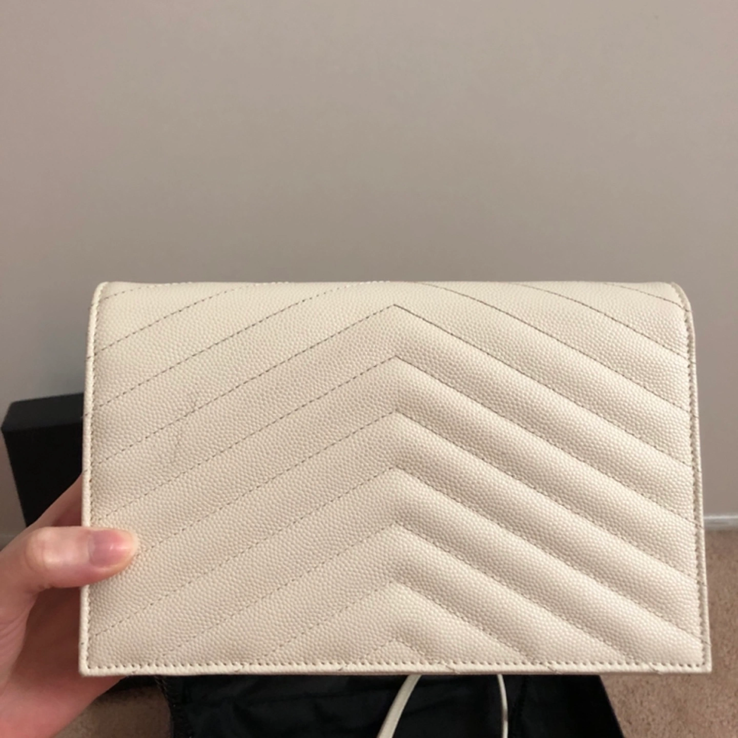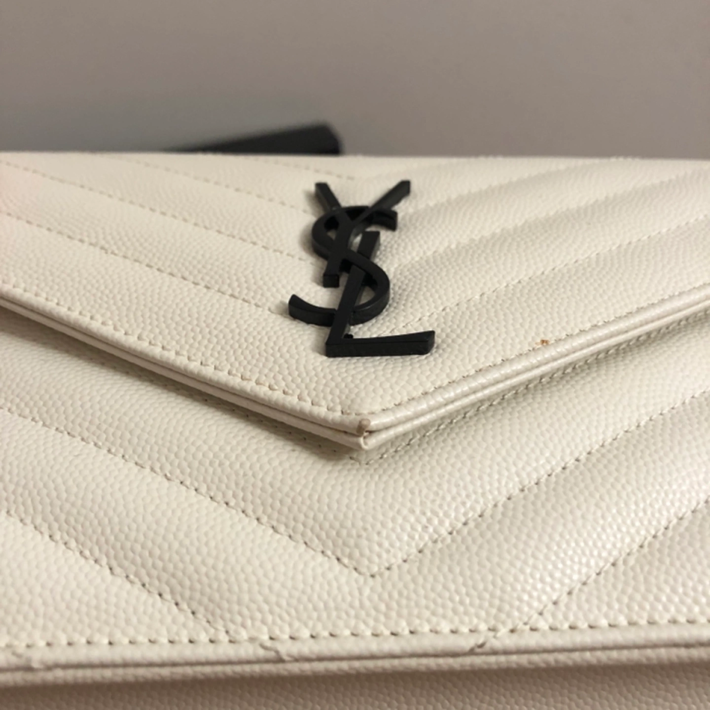 Off-white leather chain wallet. Features iconic YSL logo. Quilted design.