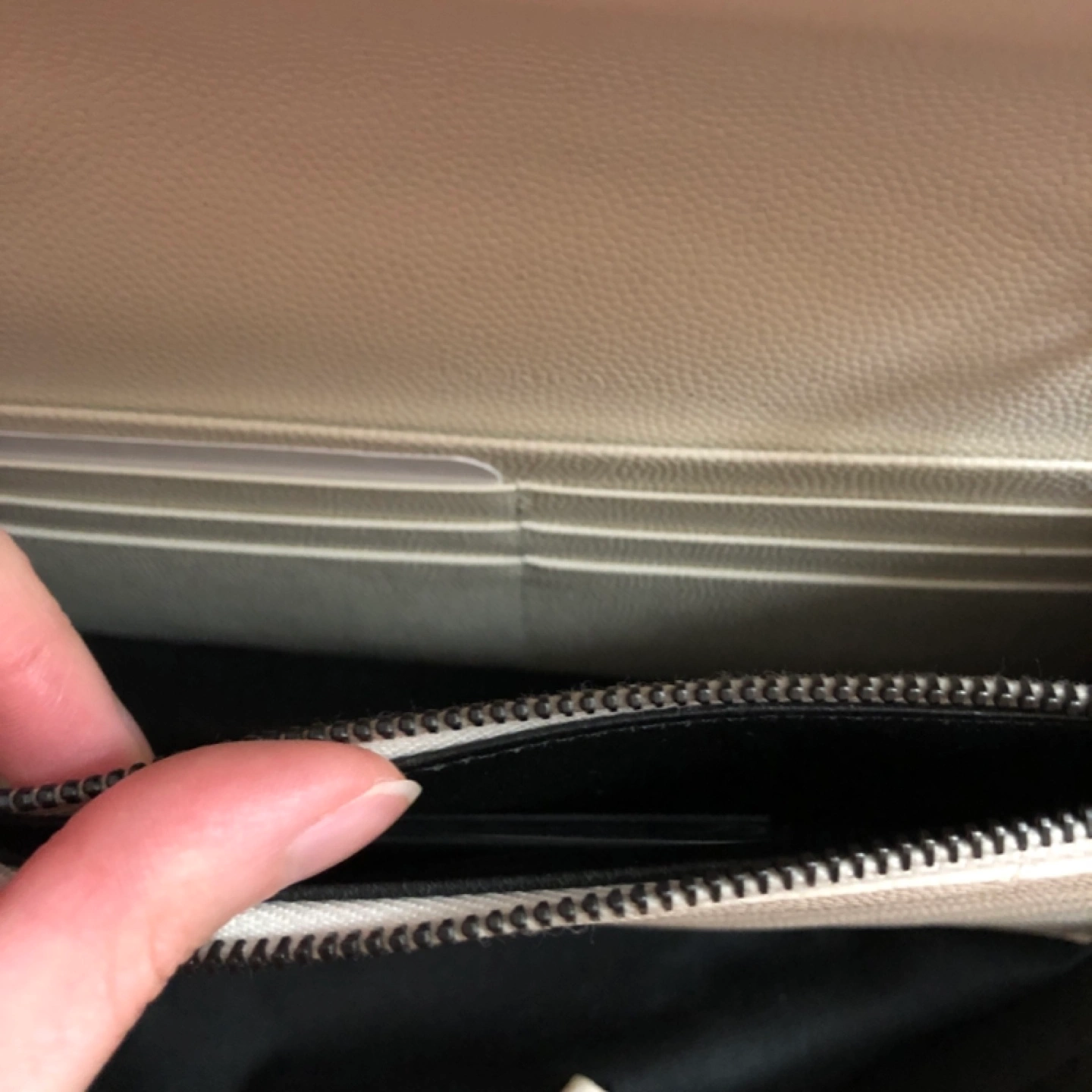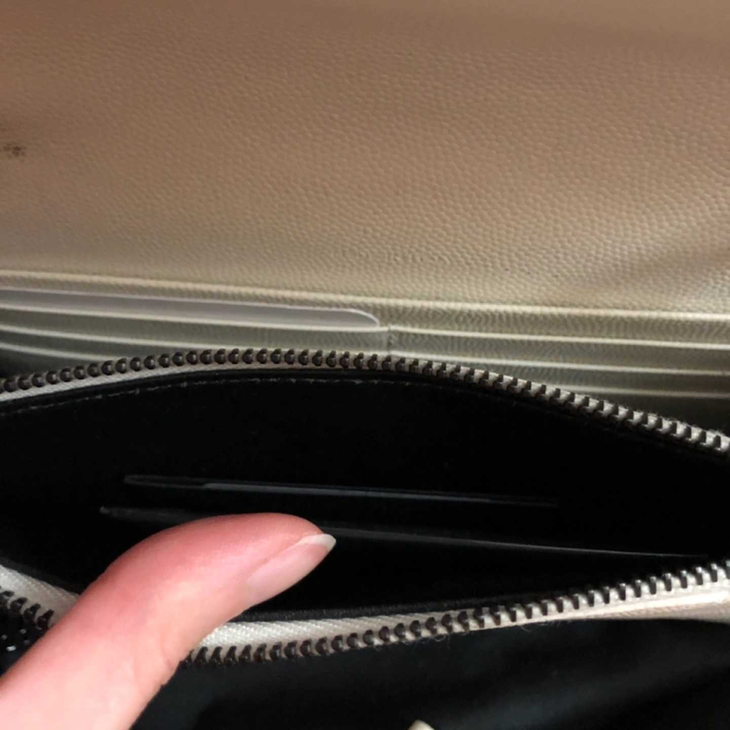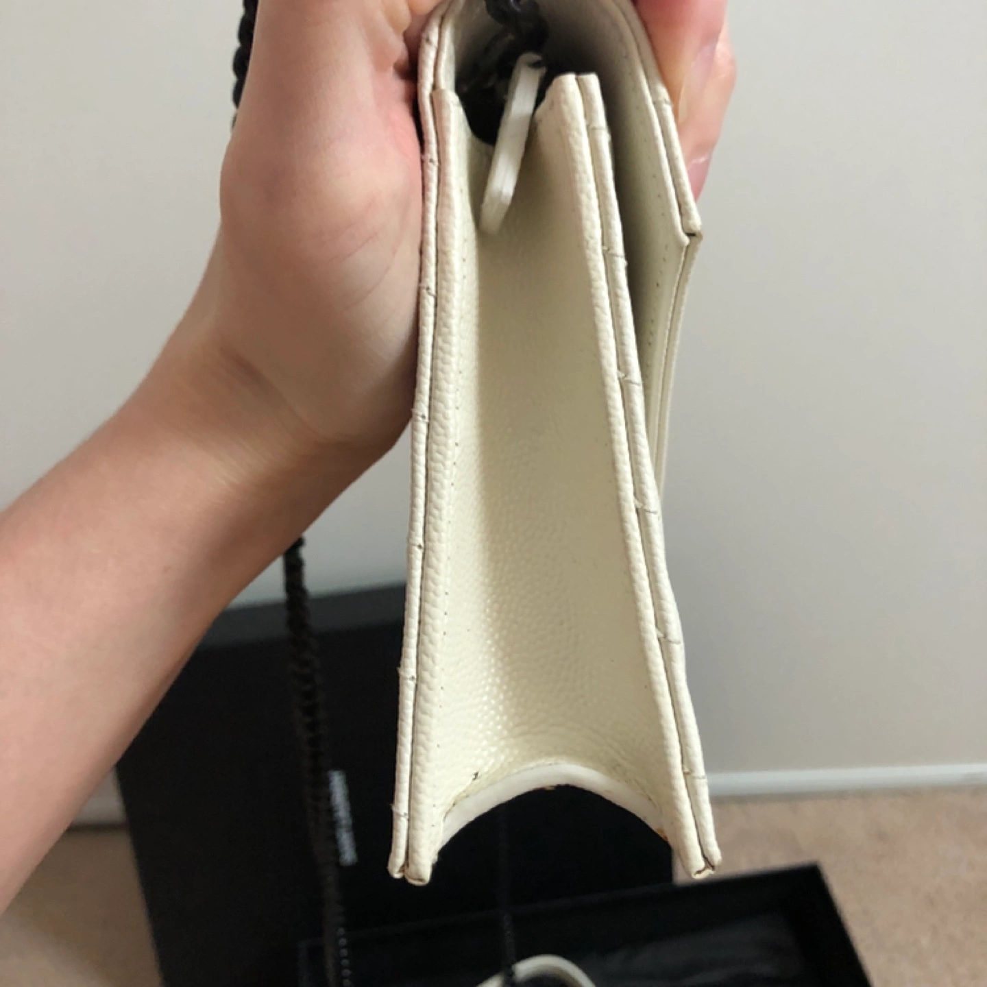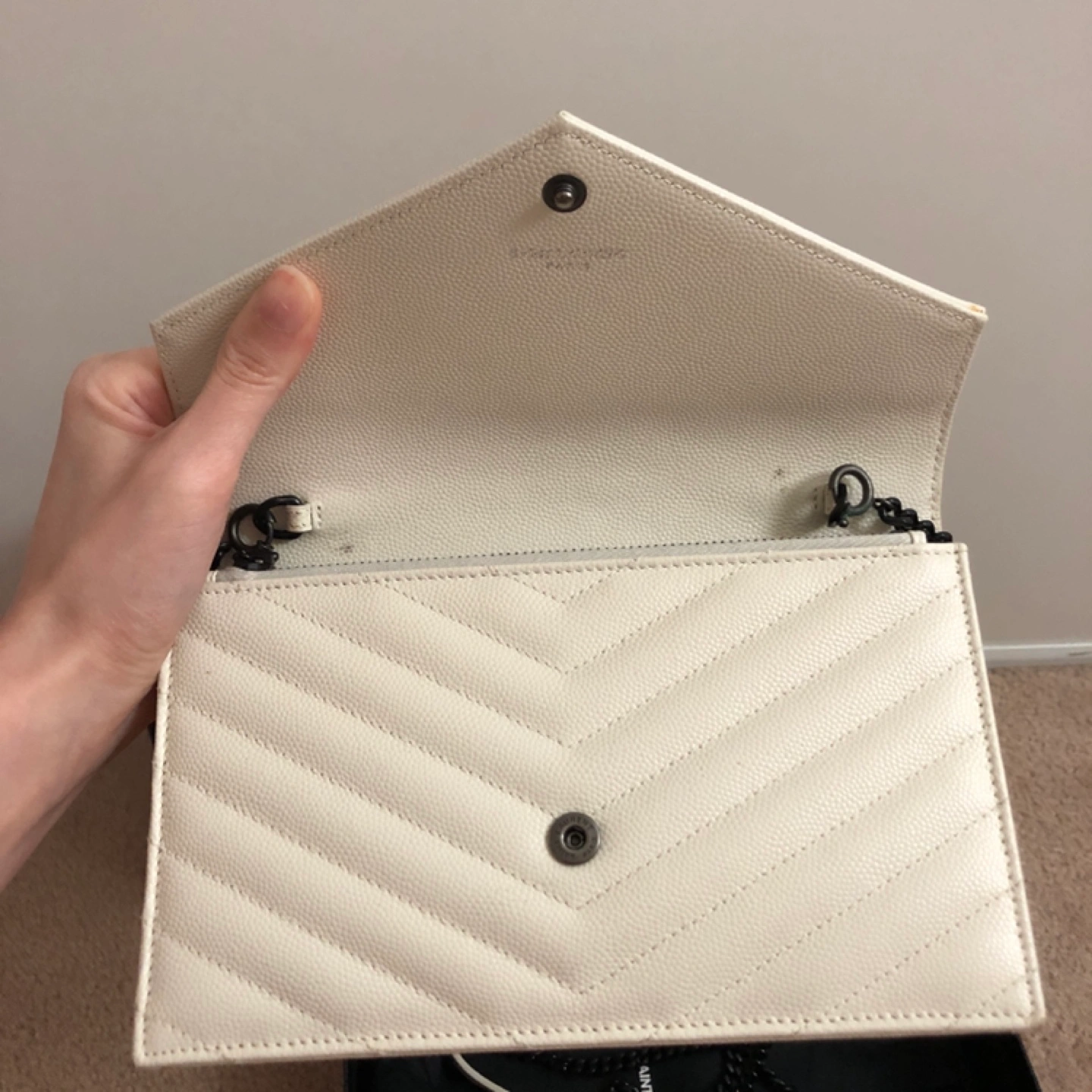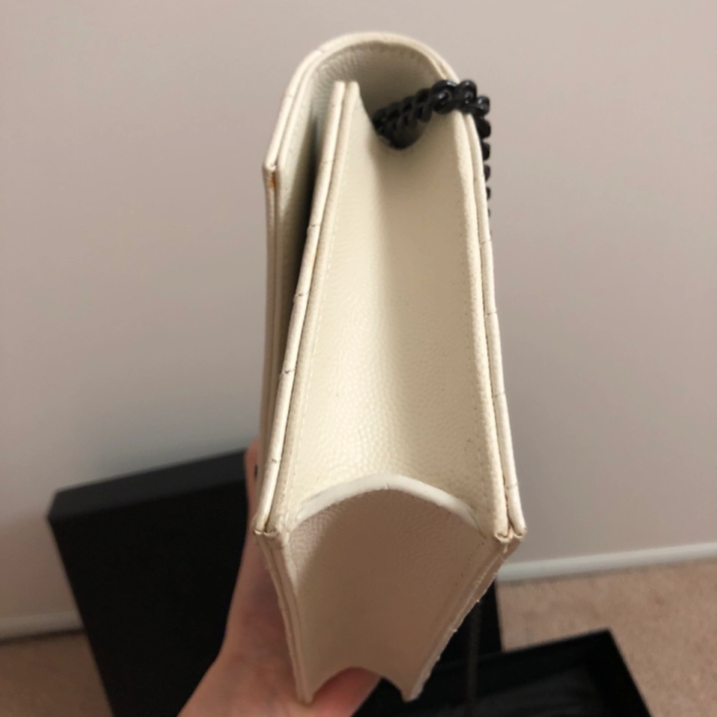 Off-white leather chain wallet. Features iconic YSL logo. Quilted design.