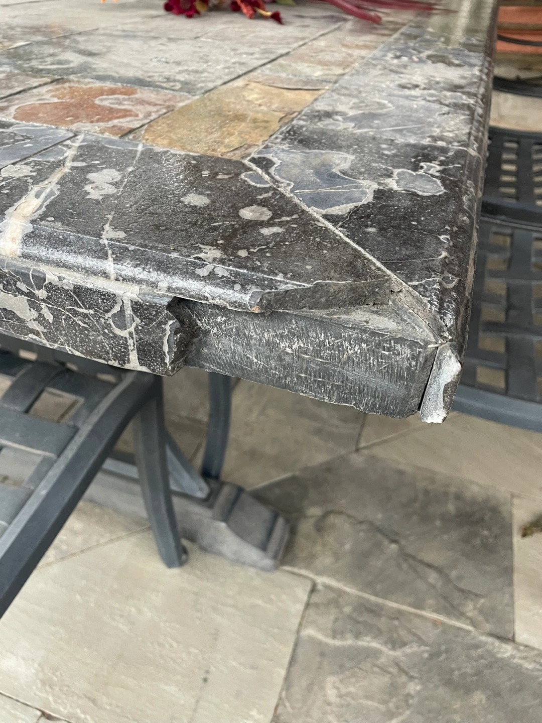 Heavy set. Table is heavy & strong to support a big umbrella. 6 heavy metal chairs. (there is a chip on one corner of table).