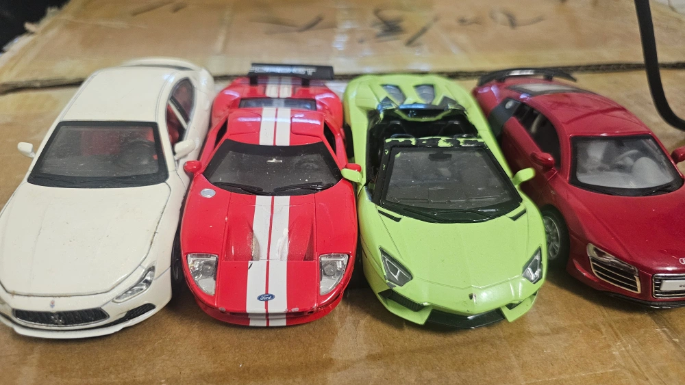 Four miniature toy cars. Includes a white Maserati, red Ford GT, lime green Lamborghini, and a red Audi R8. Great for collectors or enthusiasts.