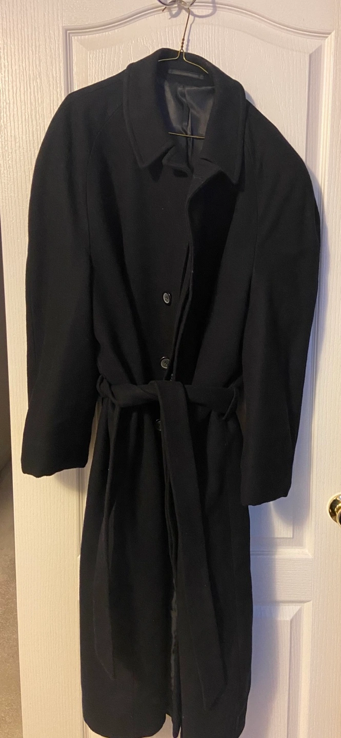 Classic black wool coat. Features a belted waist and long sleeves. Button front closure. Excellent for colder weather.