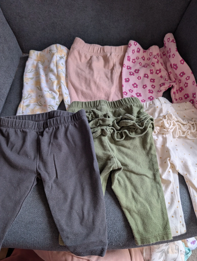 Six pairs of baby leggings. Assorted colours and patterns. Size 0-3 months. take them all for $5. Pickup only St Clair East and O'Connor