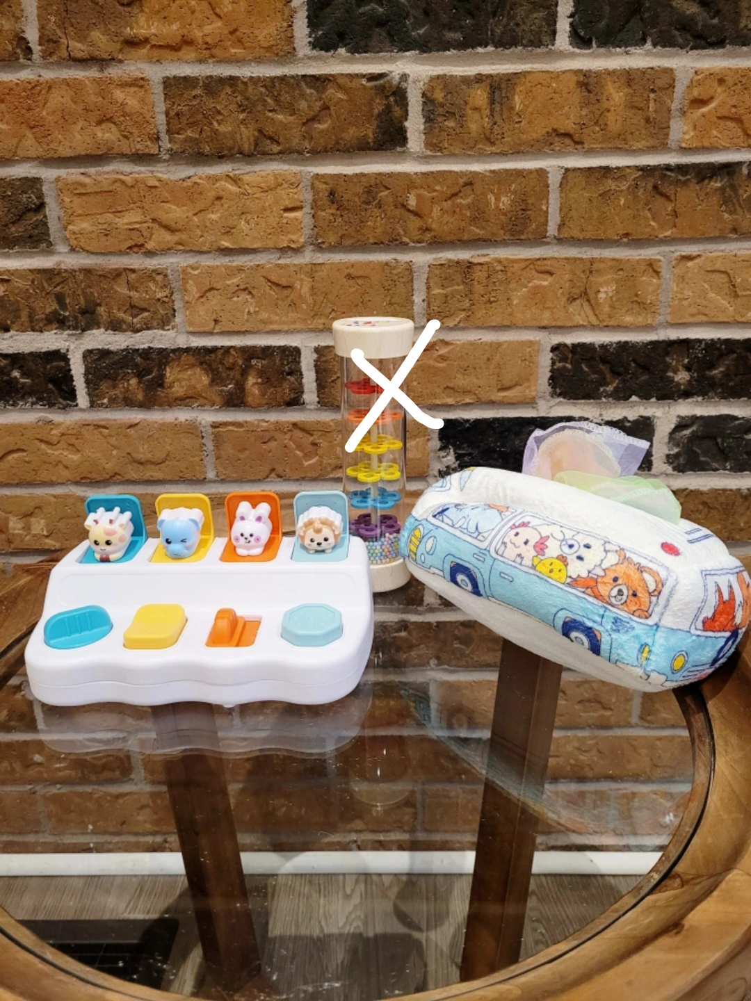 Adorable baby sensory toy bundle. Includes a cause and effect pop up toy, and a tissue box toy with play fabrics. Rainmaker not included. Great for developing fine motor skills and auditory stimulation. Perfect gift for babies and toddlers.