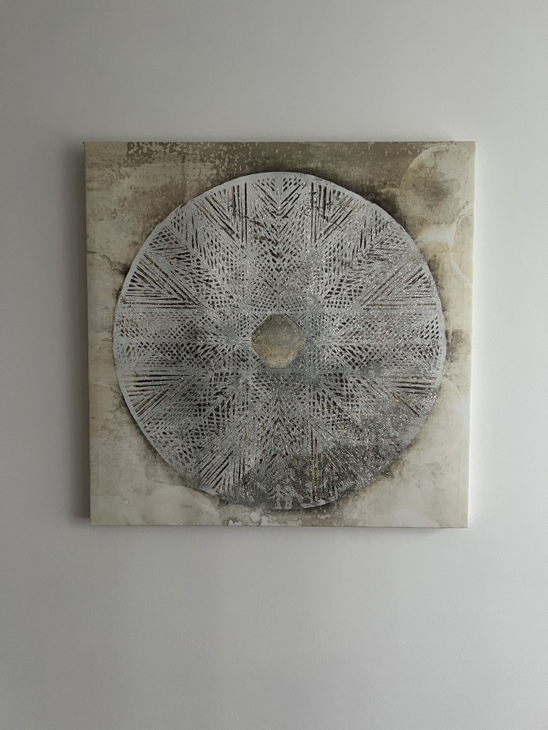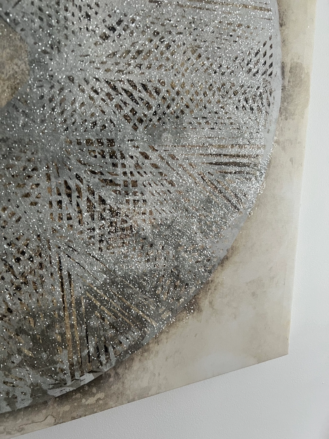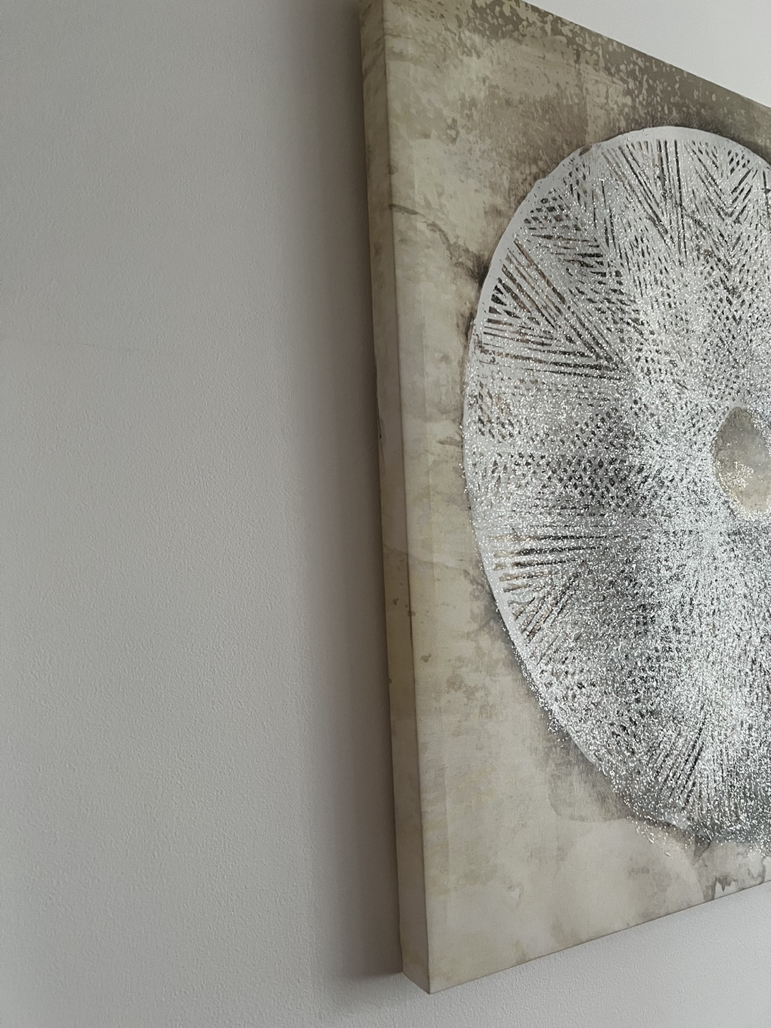 Gorgeous canvas wall art. Features a circular mandala design. Neutral colours, silver glitter accents. Adds a touch of modern elegance to any room.
