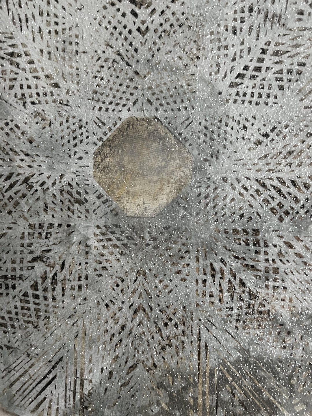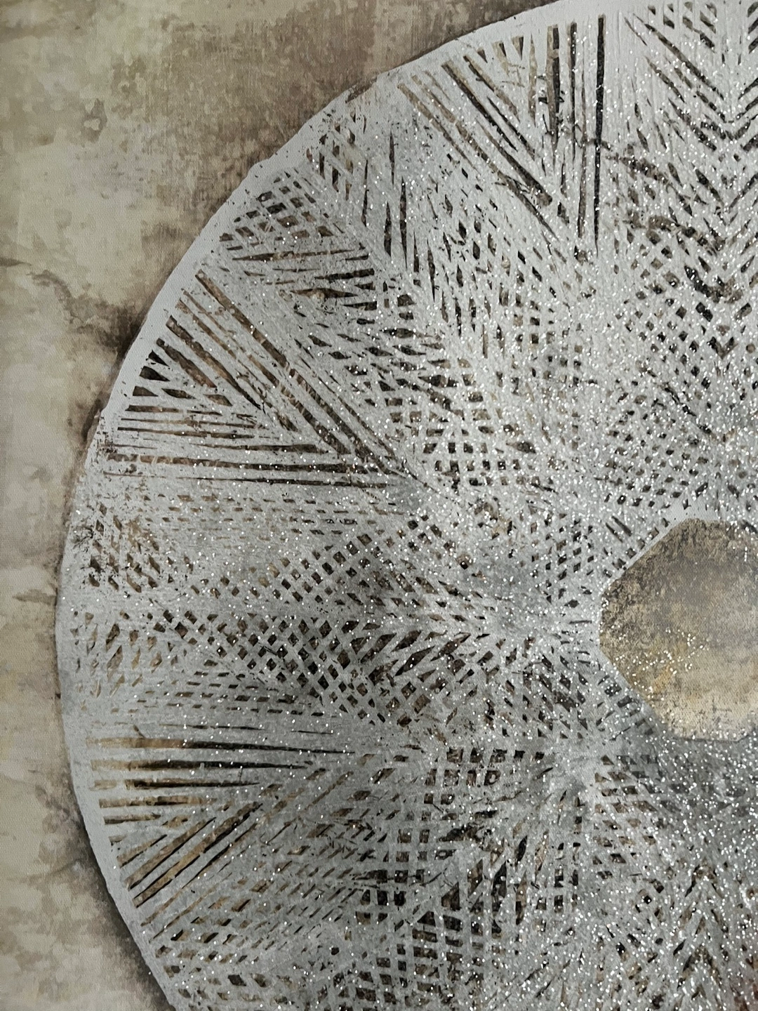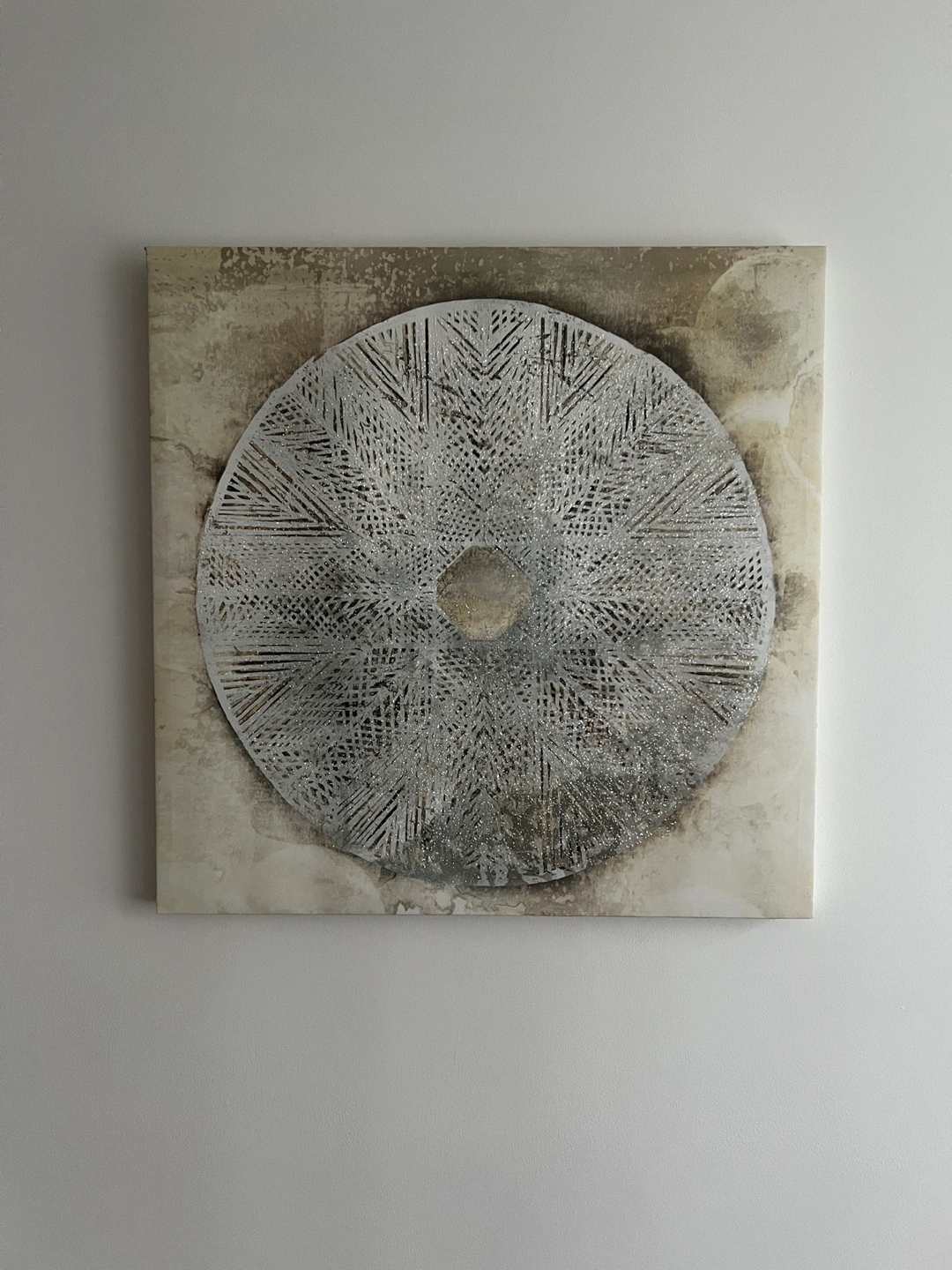 Gorgeous canvas wall art. Features a circular mandala design. Neutral colours, silver glitter accents. Adds a touch of modern elegance to any room.