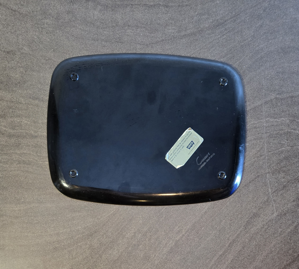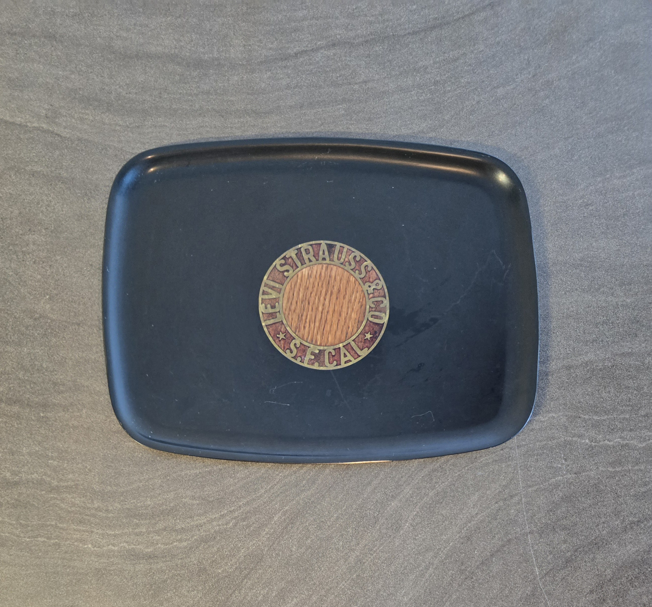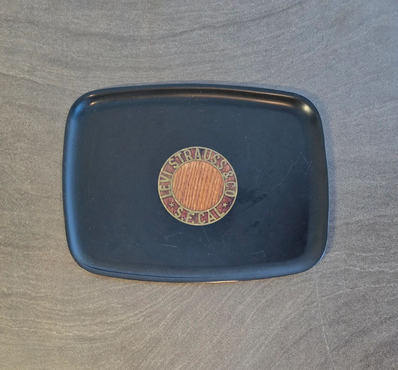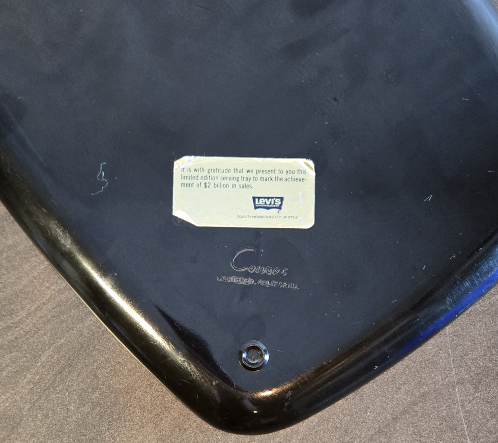 Final price drop. 1978 Limited edition promotional serving tray. 13"×10". Some surface scratches. Black resin features a wood inlay centrepiece with Levi's logo. Sticker says "It is with gratitude that we present to you this limited edition serving tray to mark the achievement of $2 billion in sales. Cross-posted.