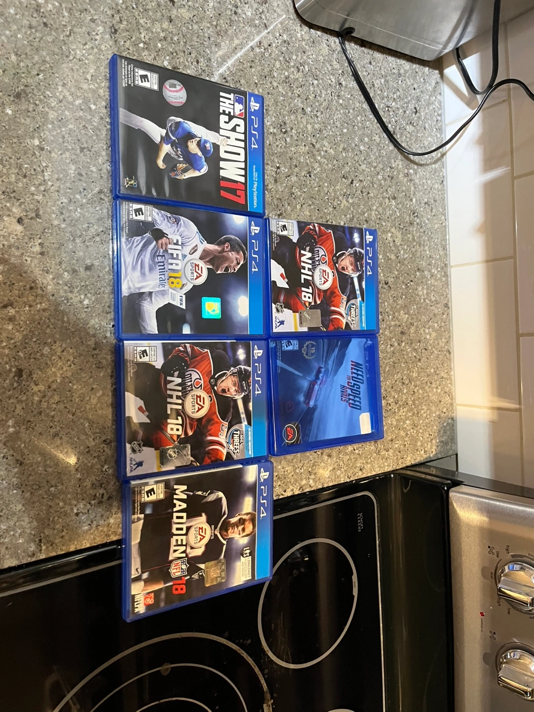 Selection of PlayStation 4 games. Includes MLB The Show 17, FIFA 18, NHL 18 (two copies)and Madden NFL 18. Pre-owned.