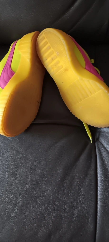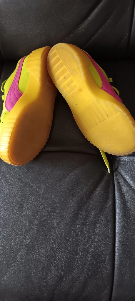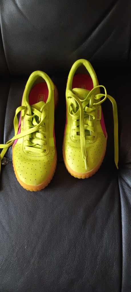 Pre-owned Puma Cali sneakers. Lime green and pink colorway. Women's size 7. Slight wear, see pictures.