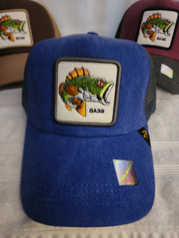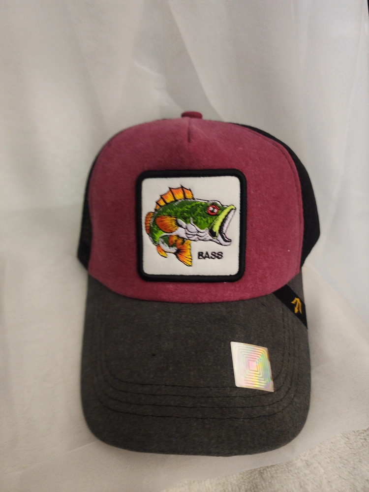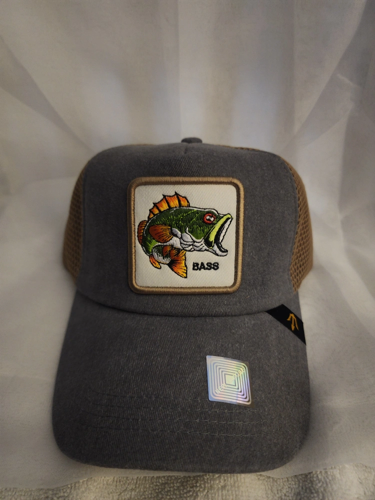 Goorin Bros. trucker hat. Features a bass fish patch. Multiple colors available. Adjustable.