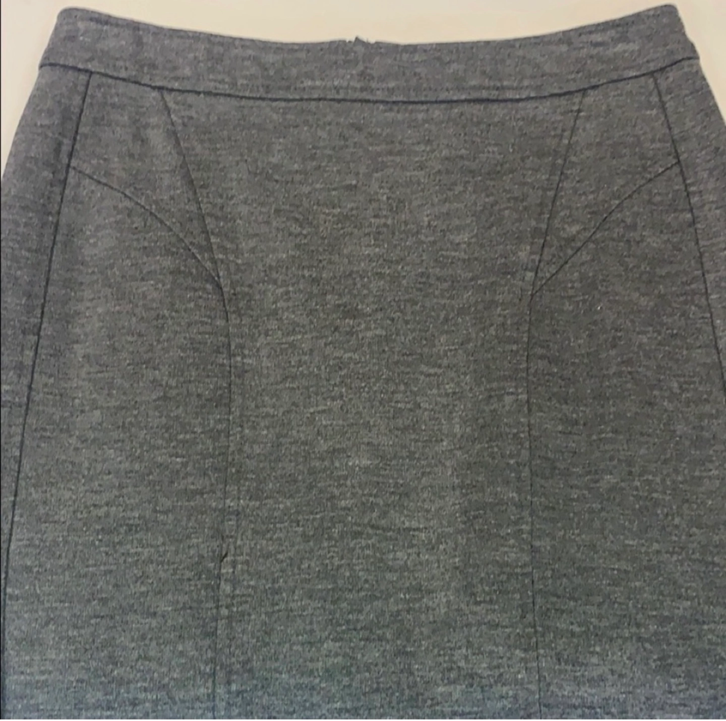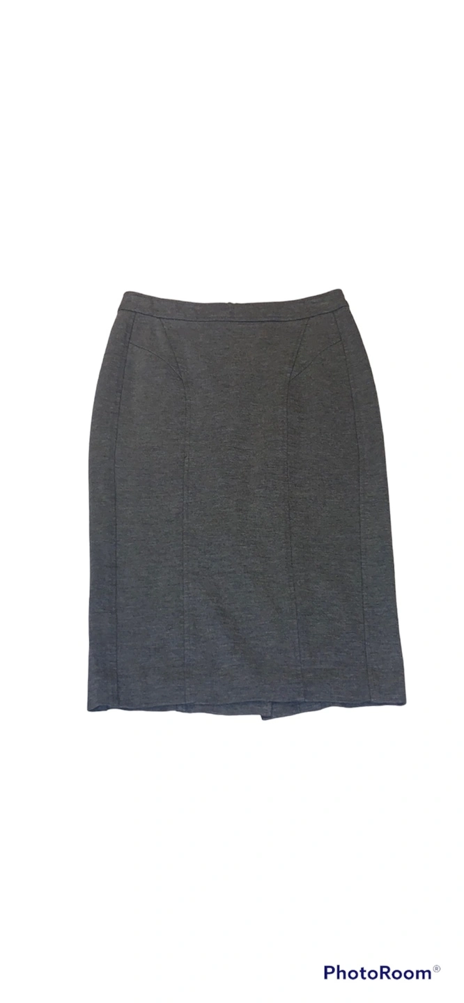 Classic grey pencil skirt. Knee-length. Fabric appears to be a wool blend. Good for work or a night out. Fabric 68% Rayon/ 27% Nylon / 5% Elastane